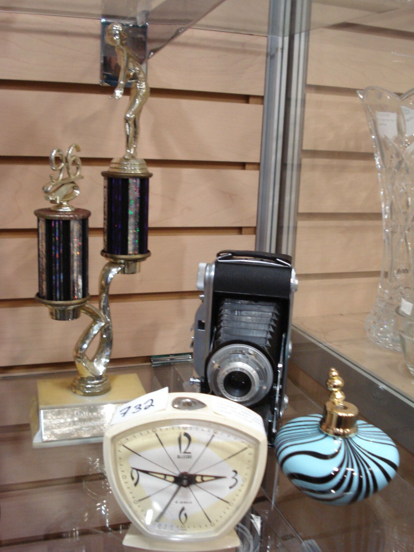 TROPHY AND BELLOWS CAMERA AND ART GLASS PERFUME AND VINTAGE DESK CLOCK