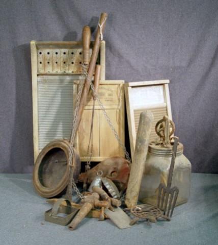 TUB LOT WITH WASHBOARDS, BUTTER CHURN, ETC.