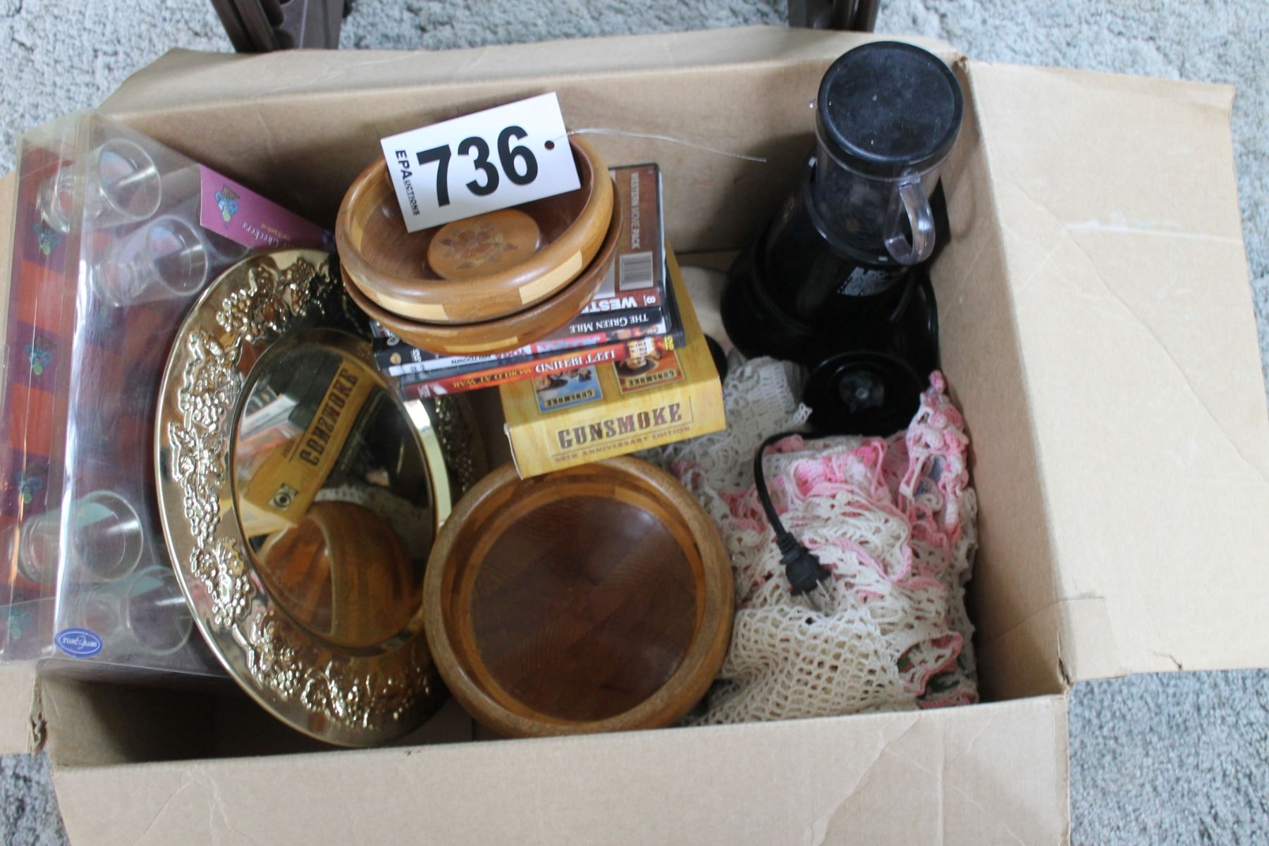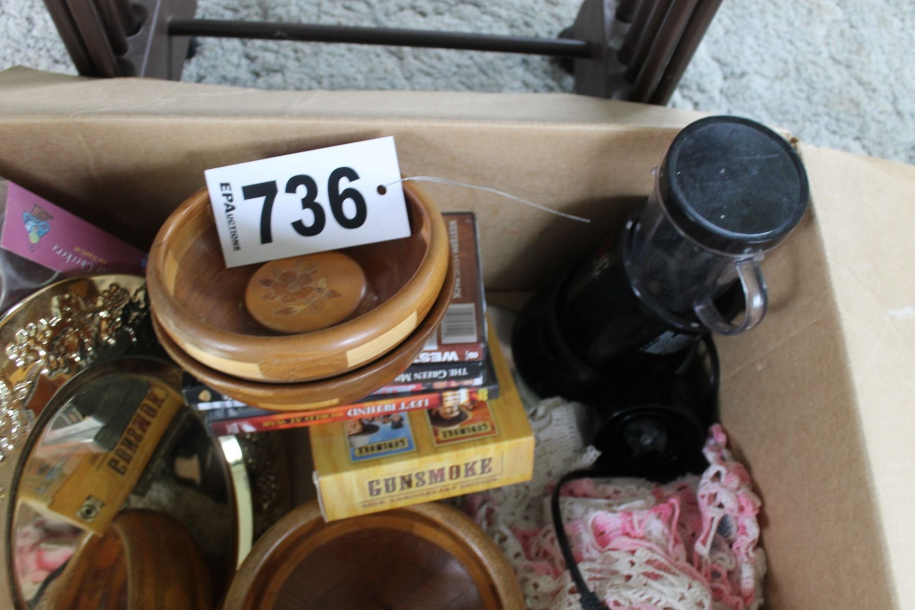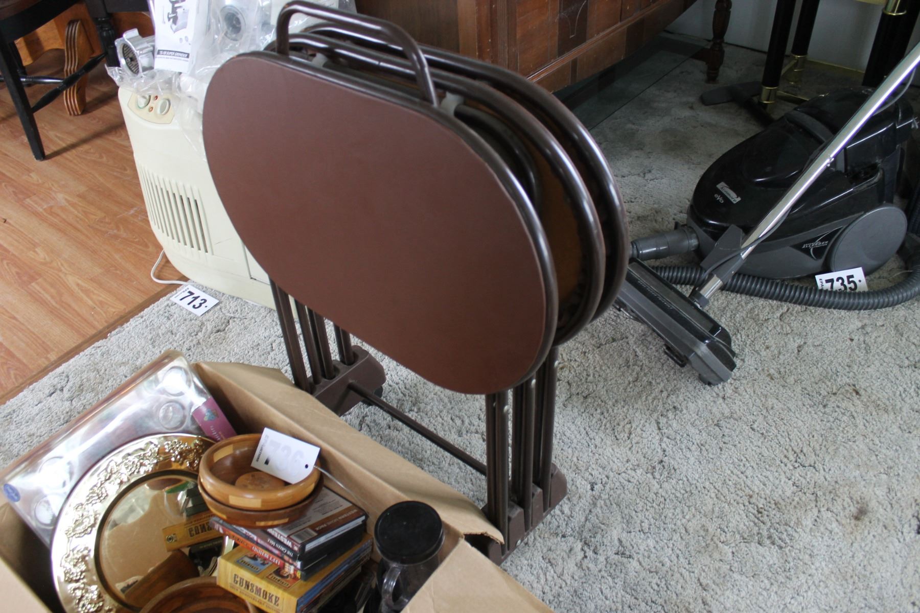 TV TABLES & STAND, BOX WITH DVD'S, WOOD BOWLS, MAGIC BULLET, ETC
