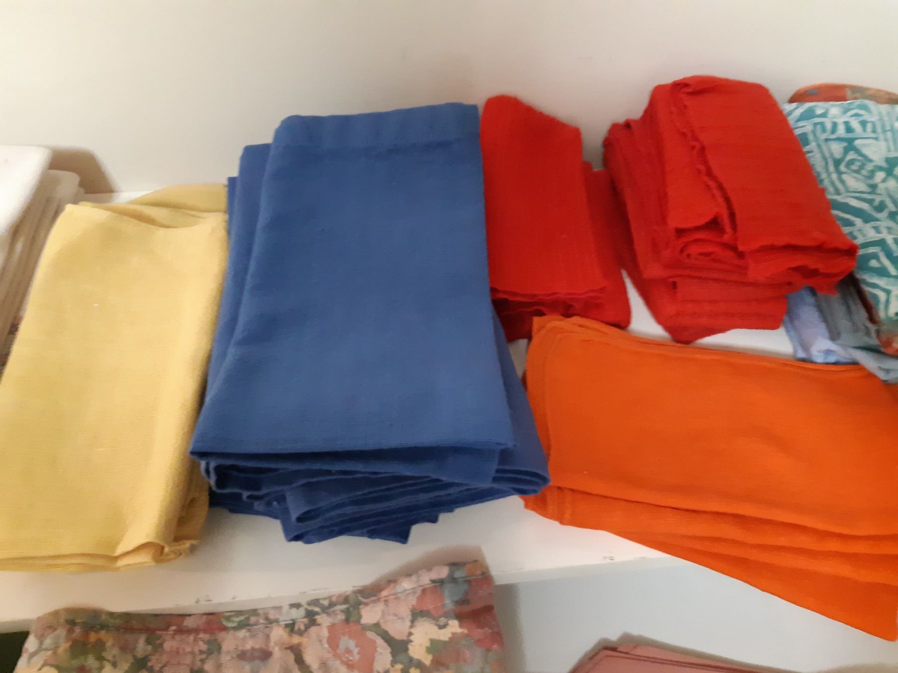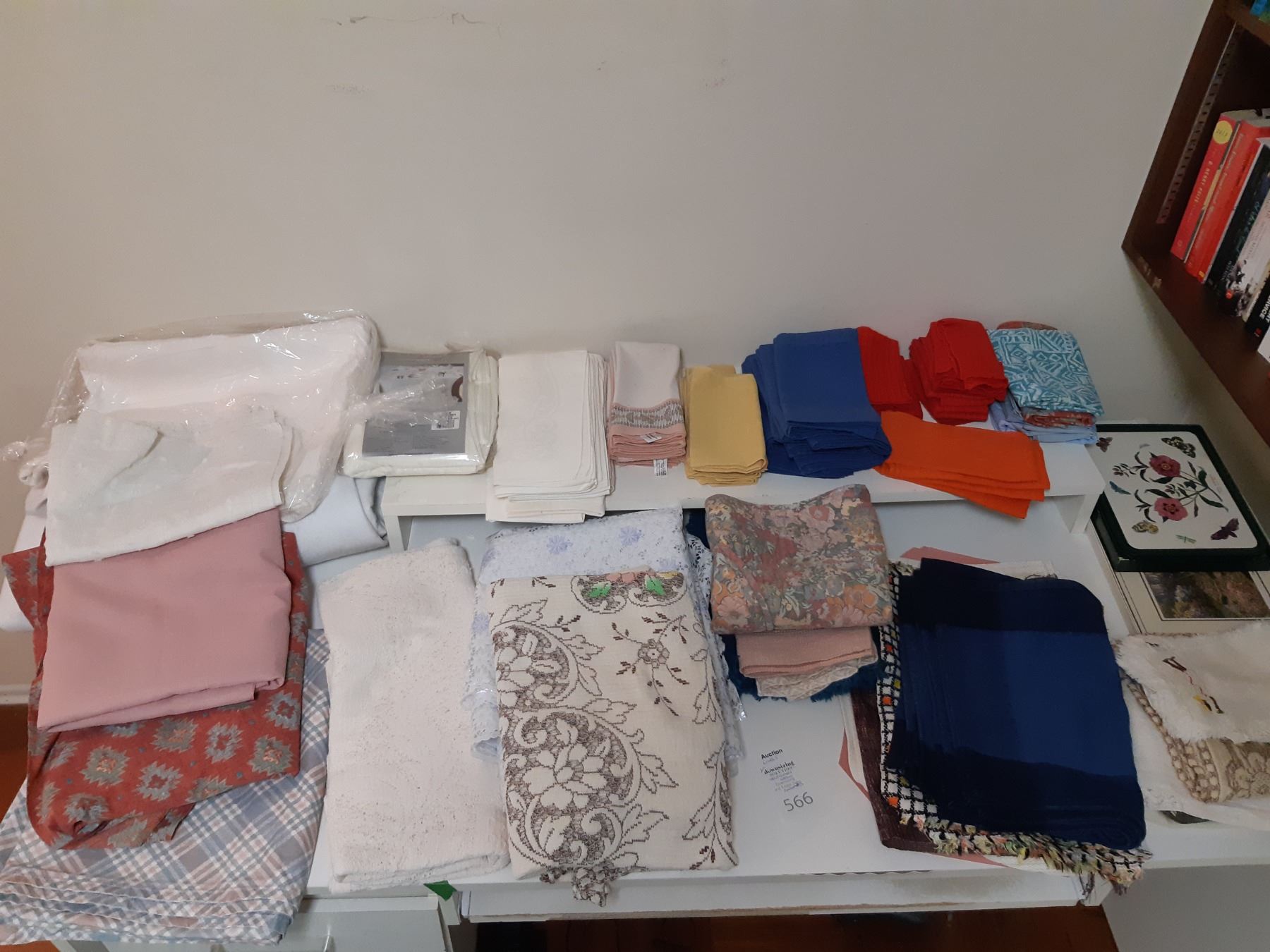 Large assortment of table linens, and napkins in various sizes, colours and fabrics. Bring packing supplies and pickup at 9 am