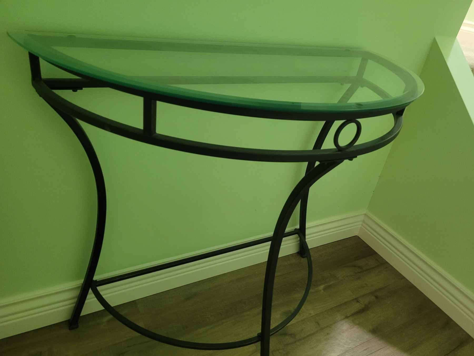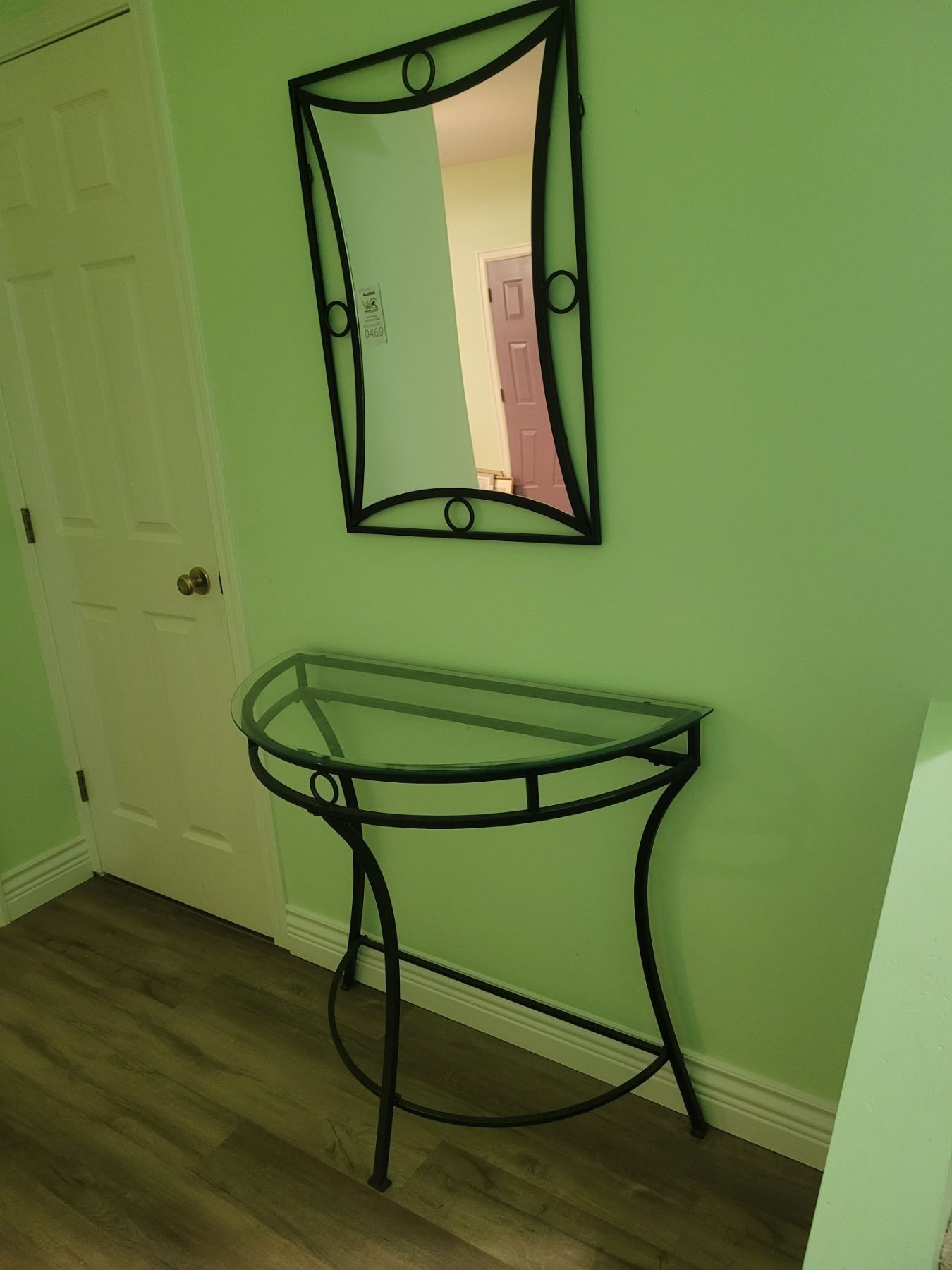Glass top metal hall table 27x17x31 and matching mirror22x31 Basement Pickup at 11 am