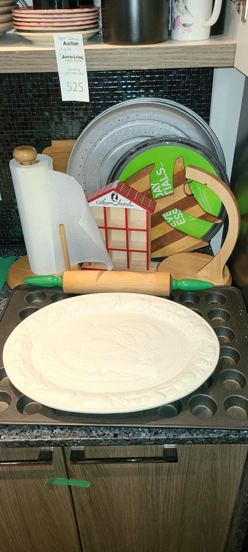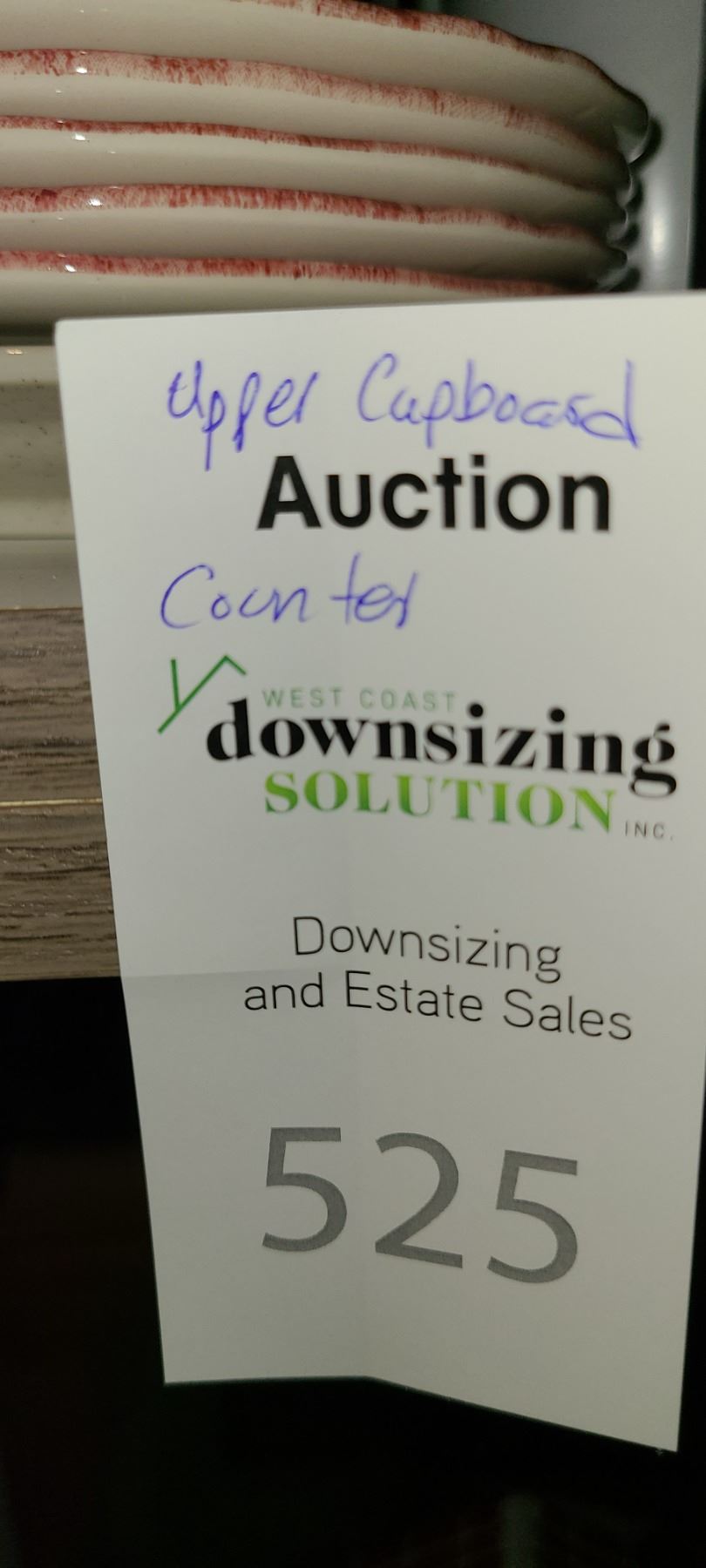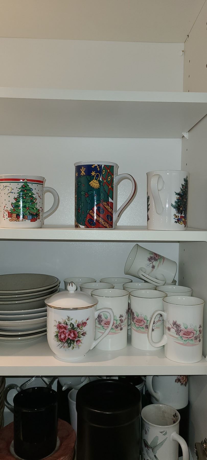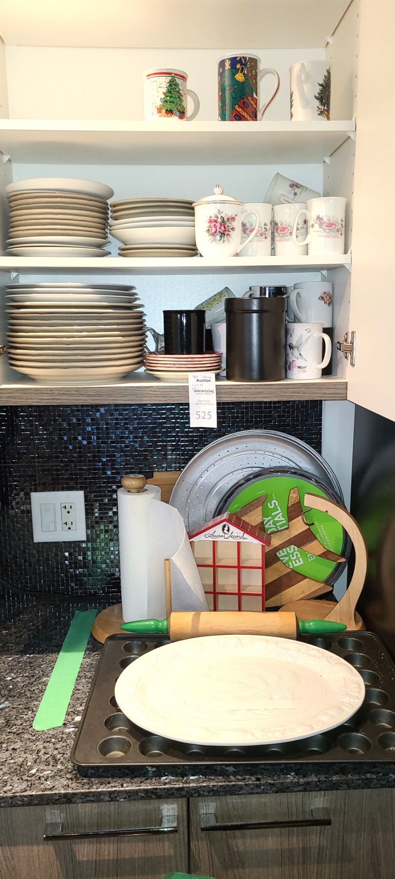 Upper cupboard, tableware, coffee mugs, counter serving platters, muffin tin. Bring packing and pickup at 9 am