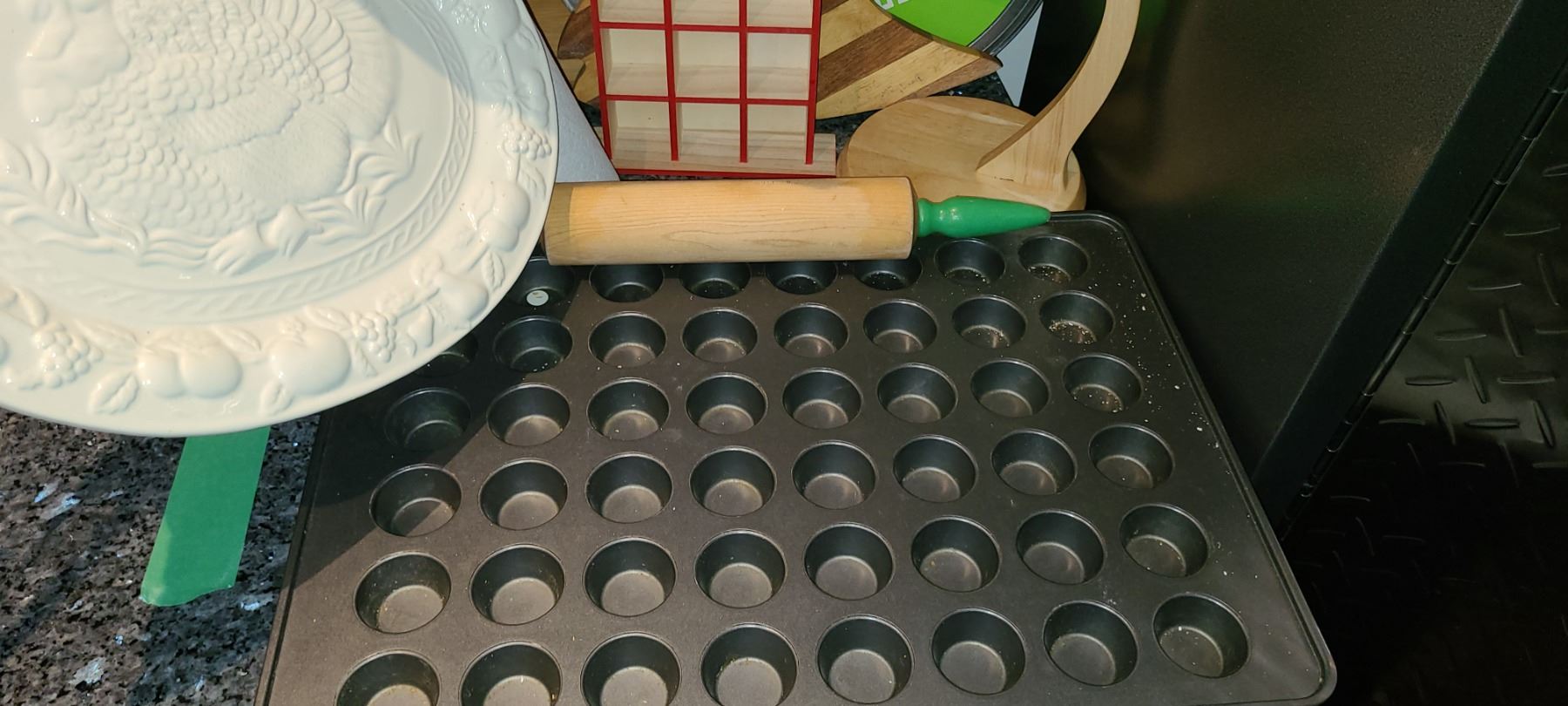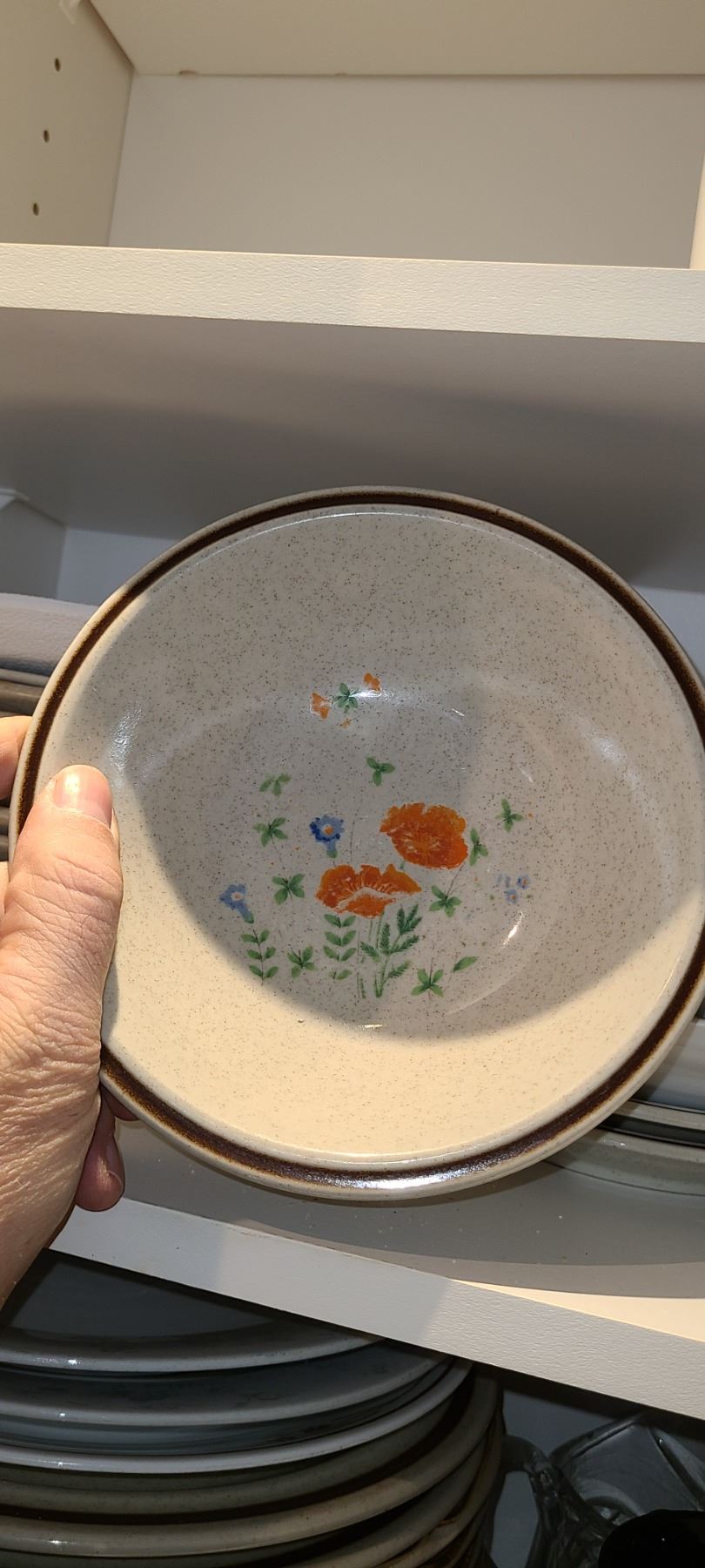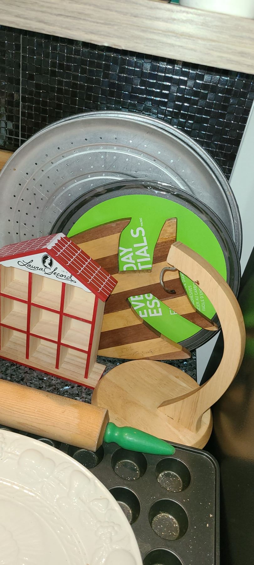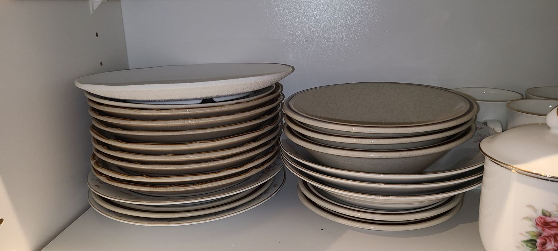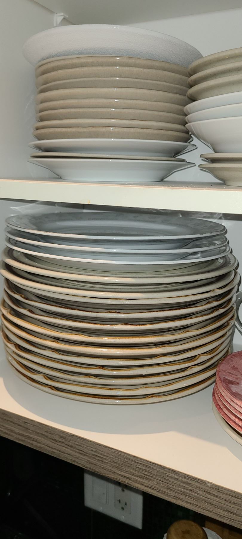 Upper cupboard, tableware, coffee mugs, counter serving platters, muffin tin. Bring packing and pickup at 9 am