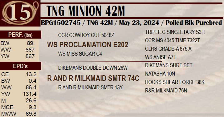TNG MINION 42M - Homo Polled. Homo Black - AI Bred on June 5th to WLE UNO MAS X549 (CSA 1141301) Confirmed safe Due Date: March 14th 2026