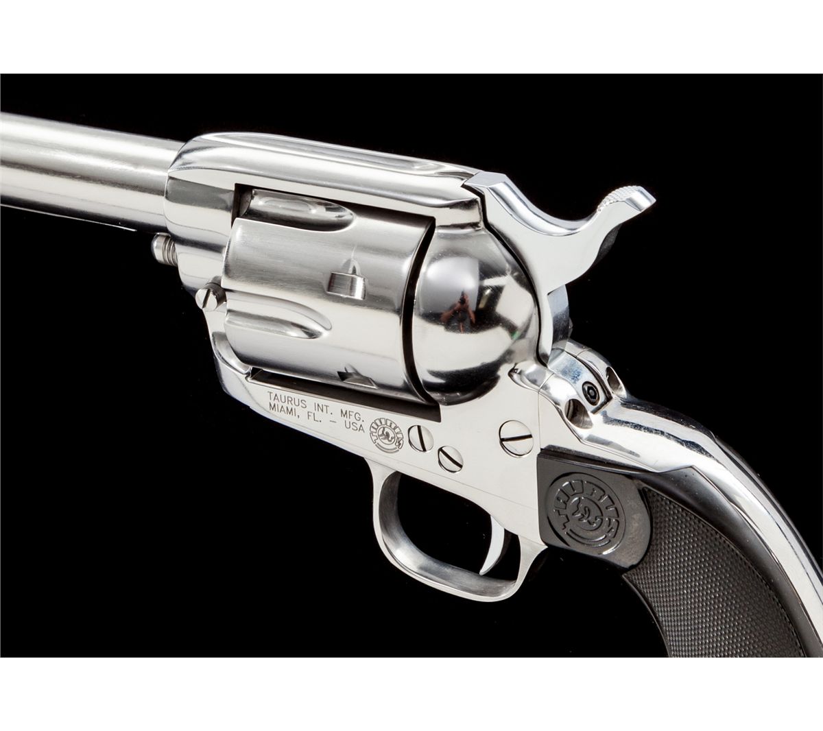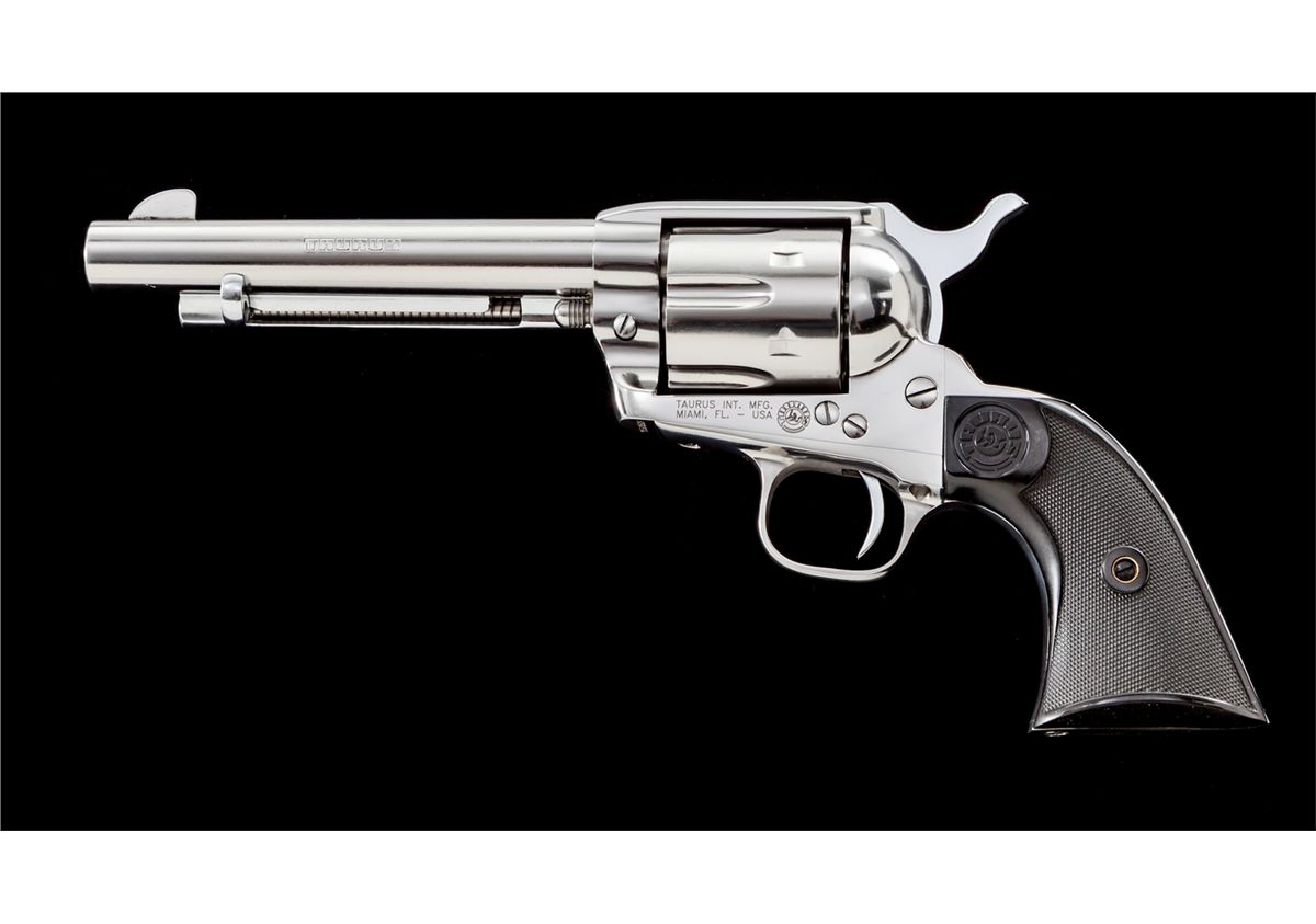 Taurus Single Action Revolver, #YE301508, .45 Colt cal., 5-1/2'' barrel, polished stainless steel finish, checkered black plastic grips, in original box. Condition is excellent, appearing as new and unfired. Est.: $500-$750. (Modern)