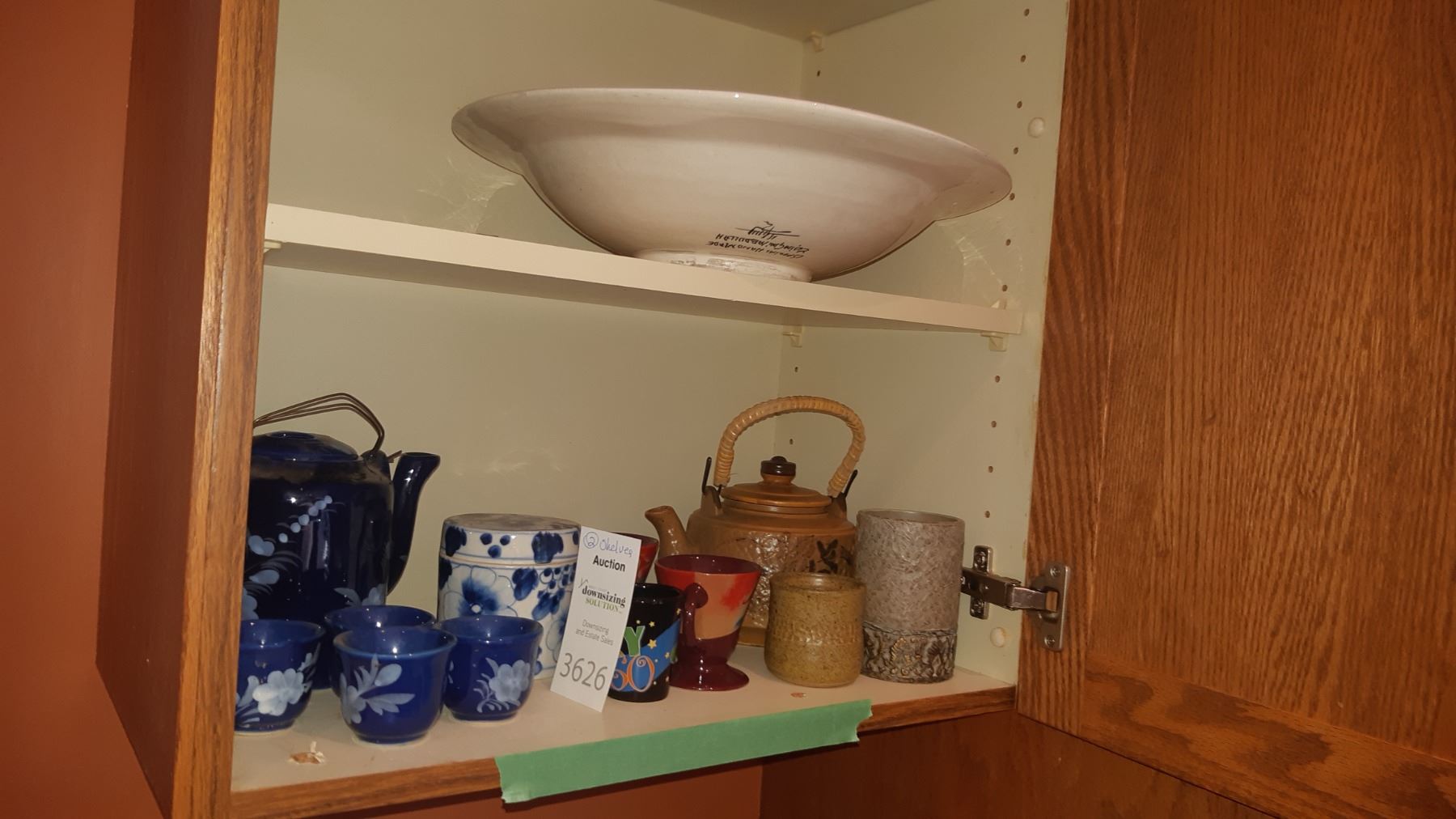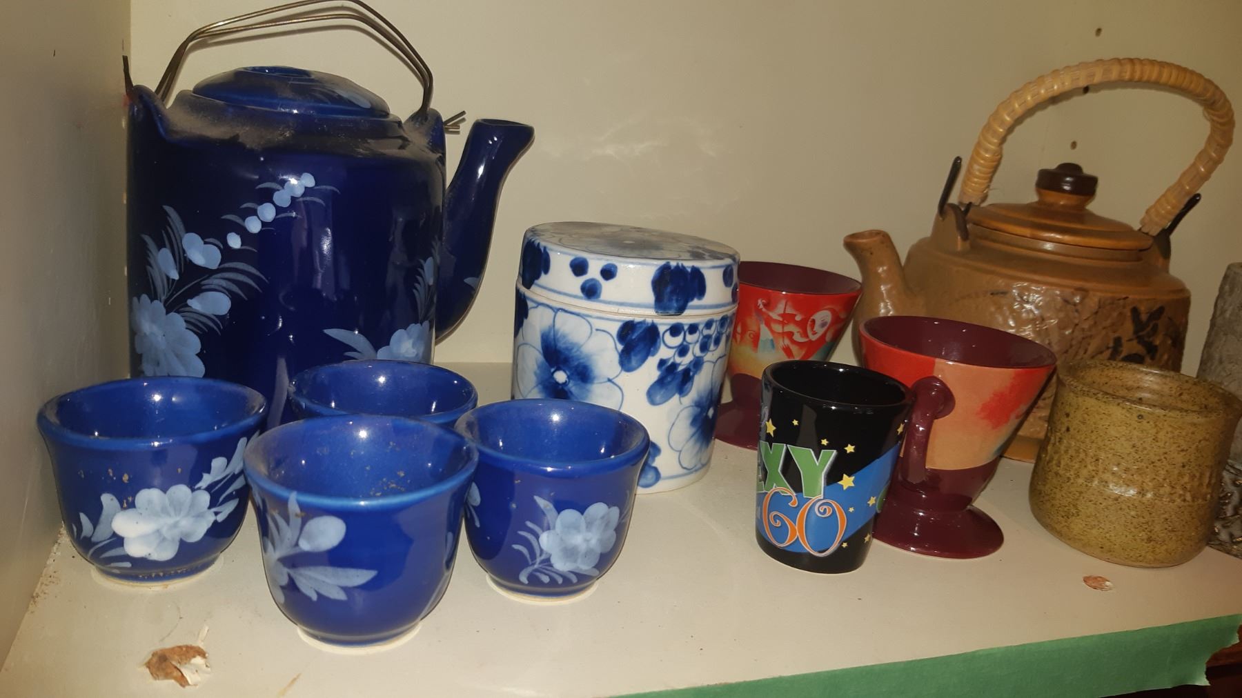 Blue & White tea pot with cups, hand painted. Pottery tea pot, hand made bowl. Pick up 9-10