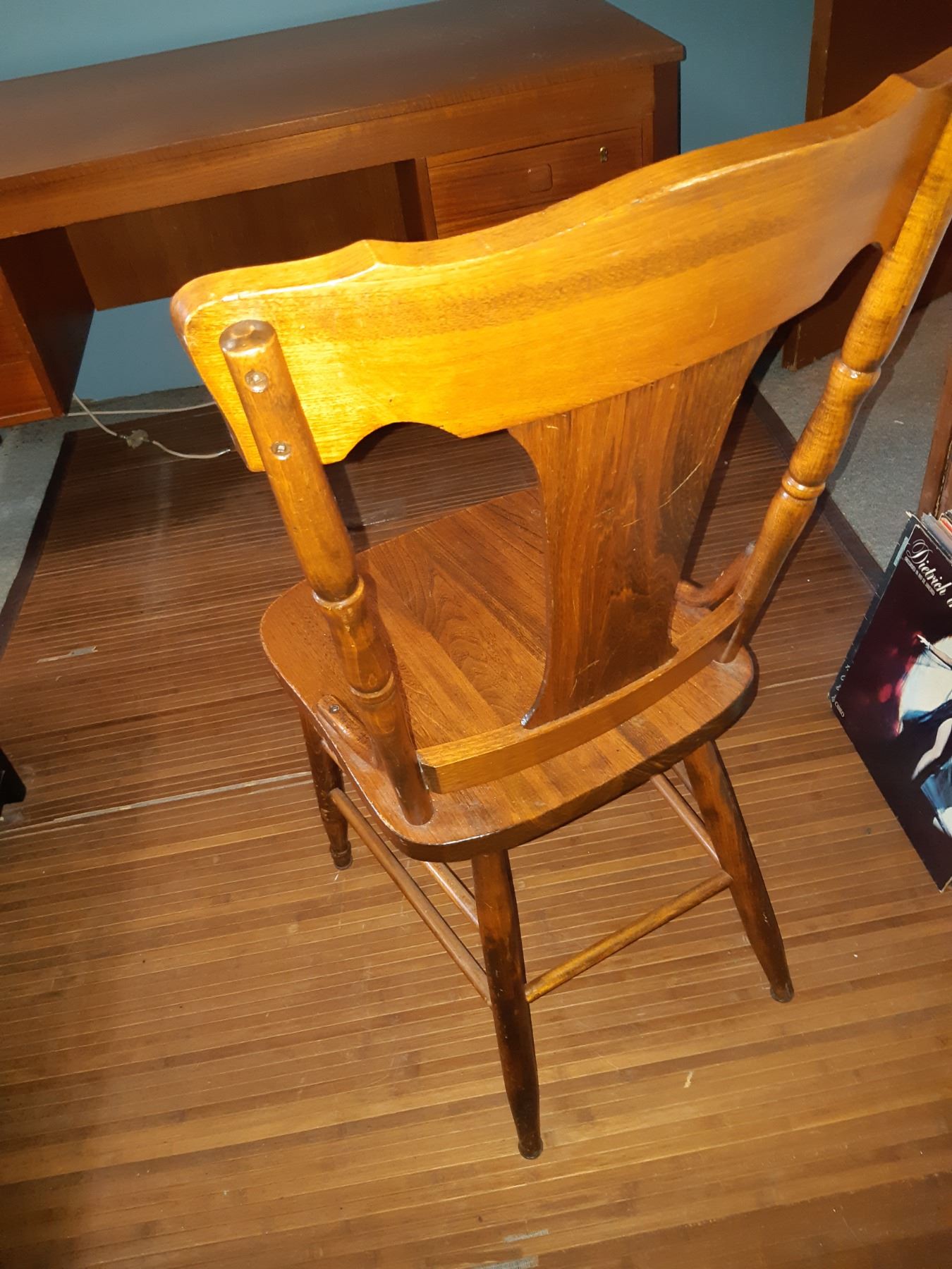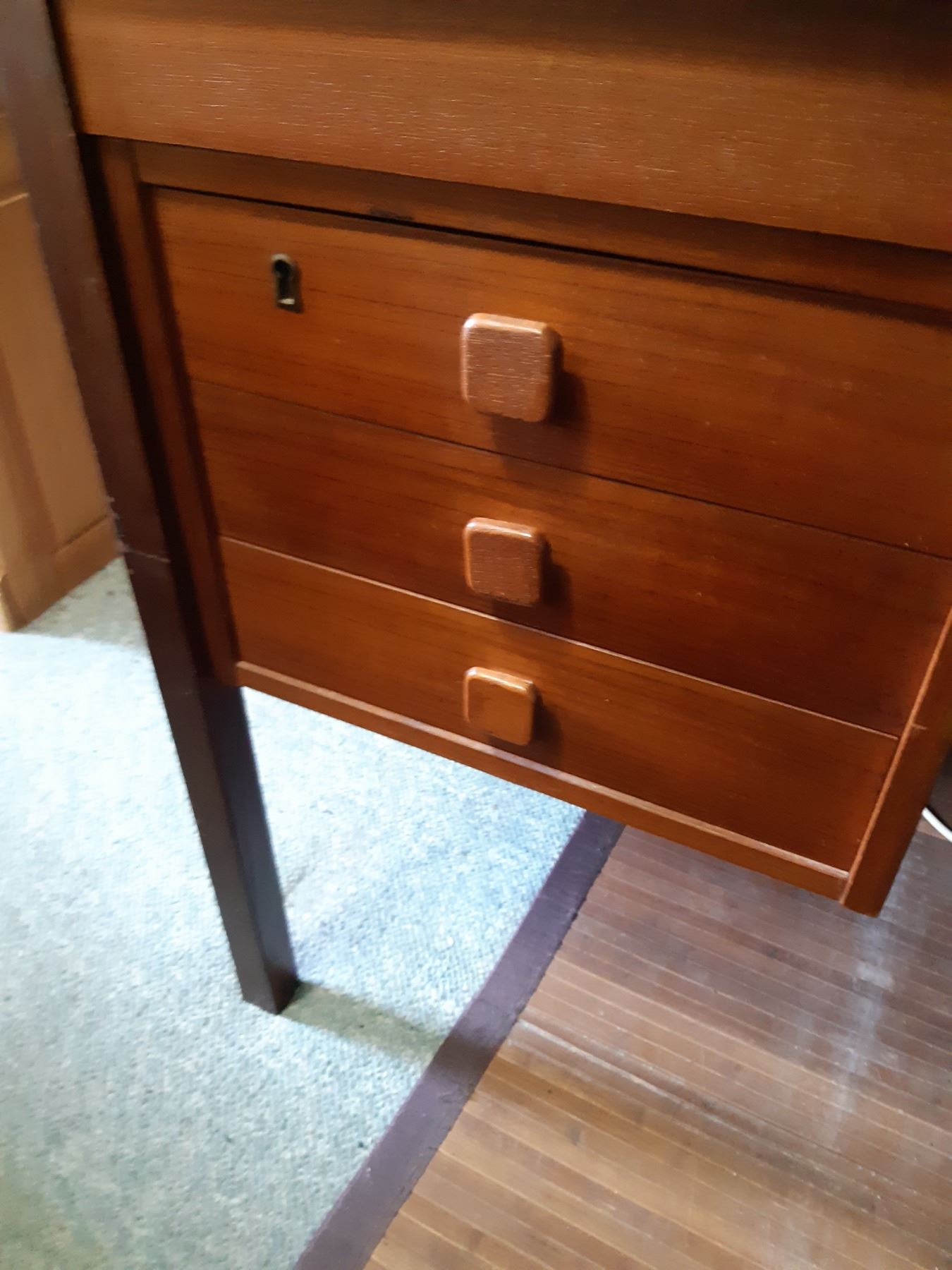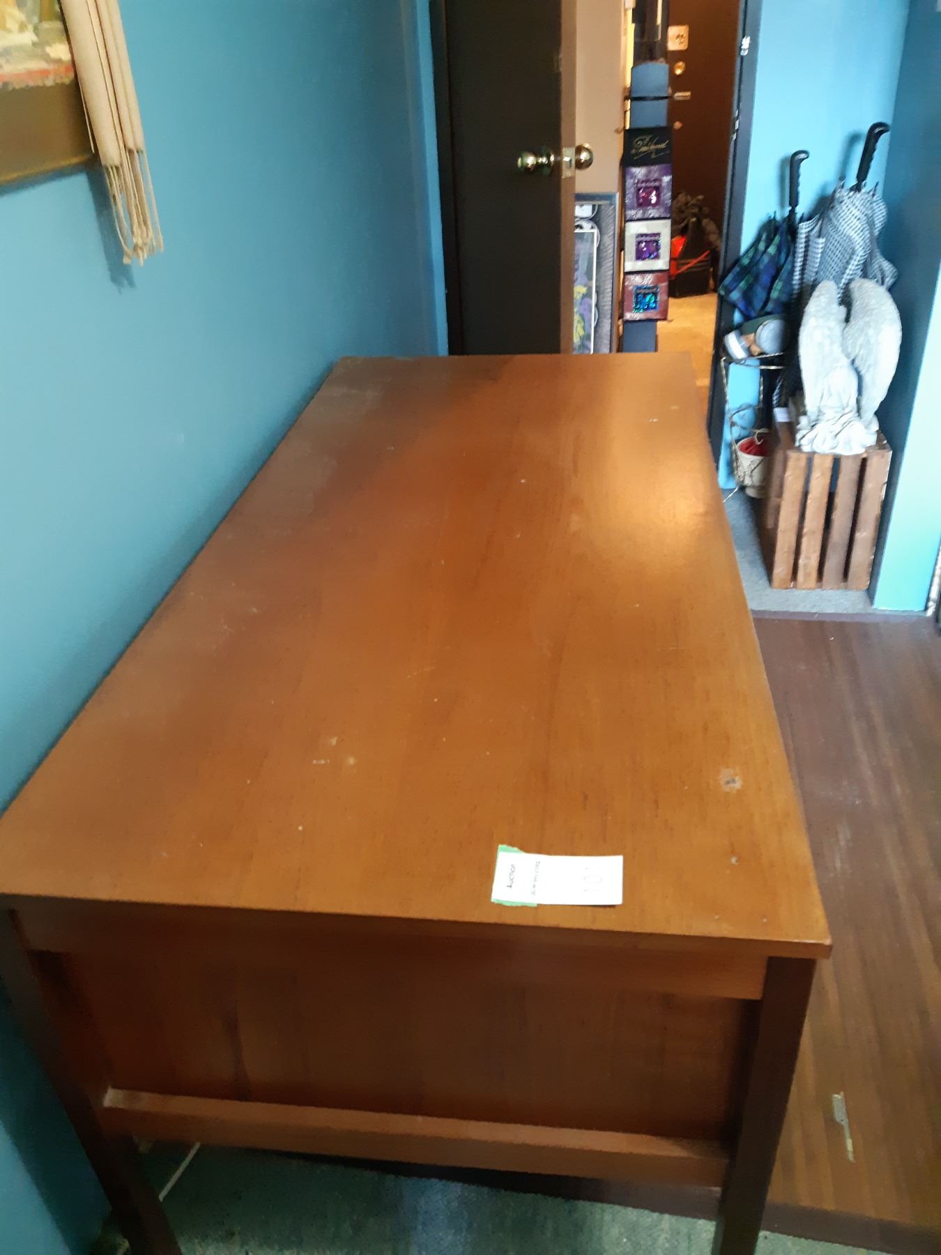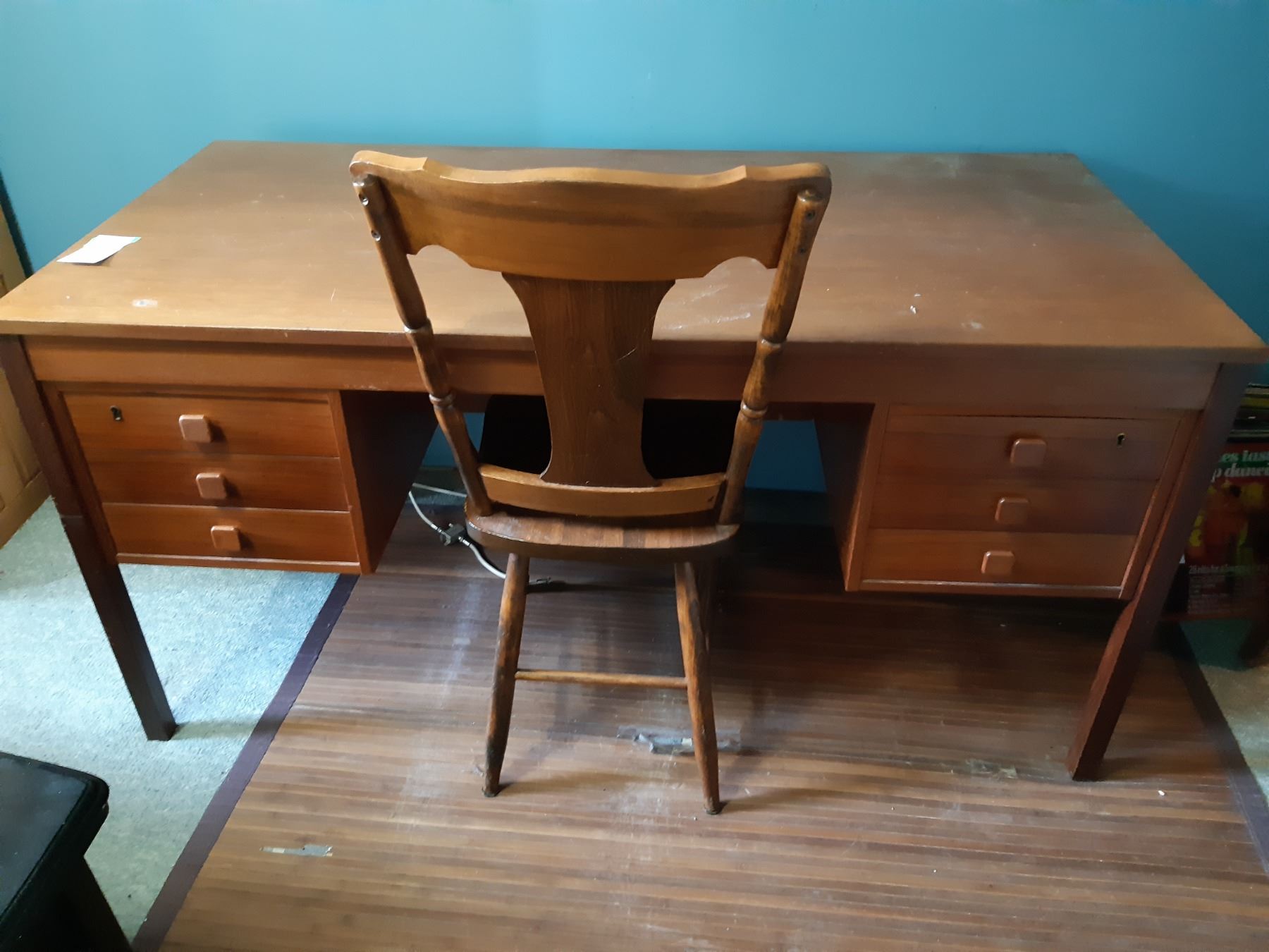 Teak desk 57x28x29 and chair 16x15x37 included. Has some marks on top. Very heavy desk, bring help to move. Pickup at 11 am.