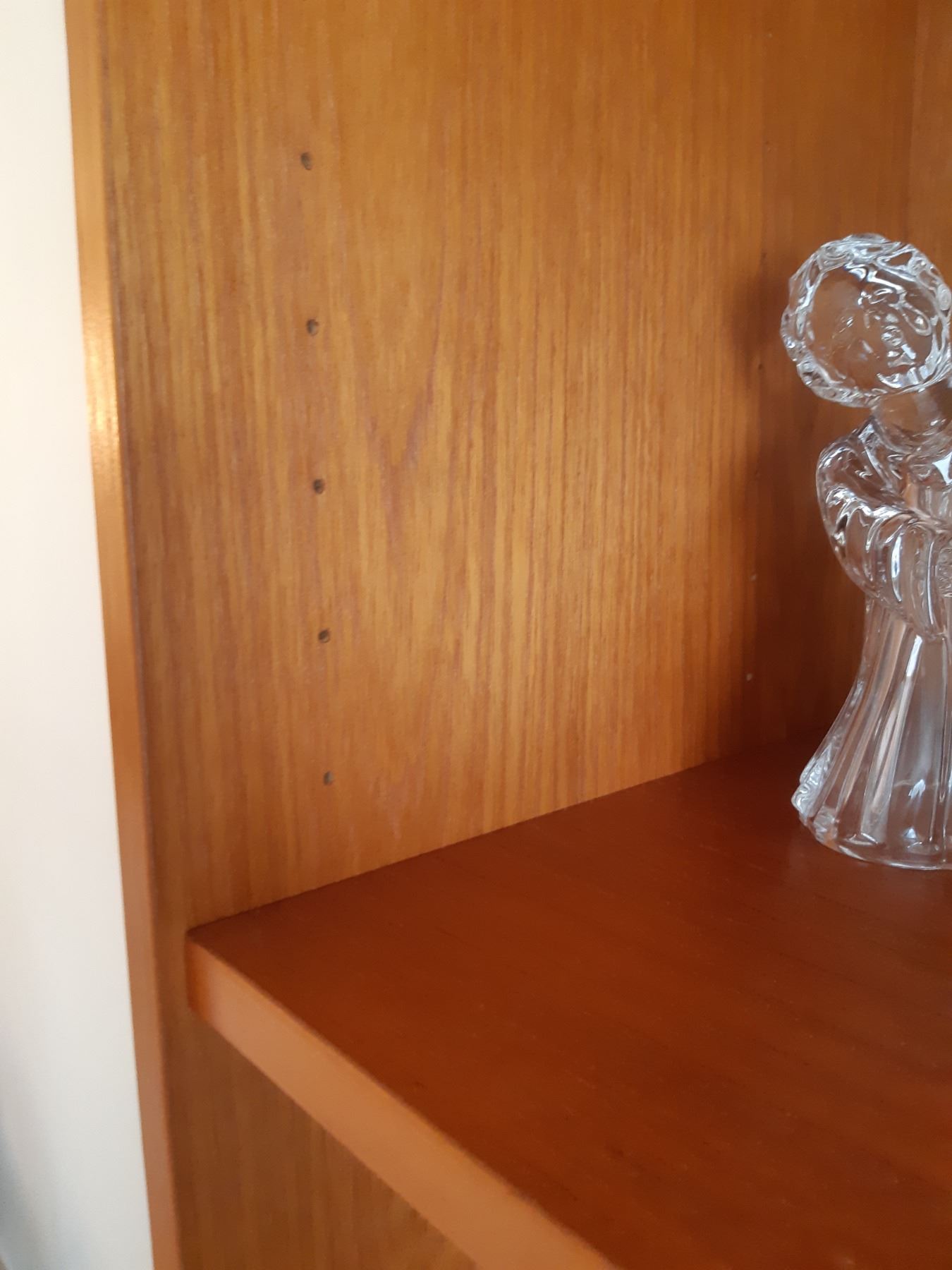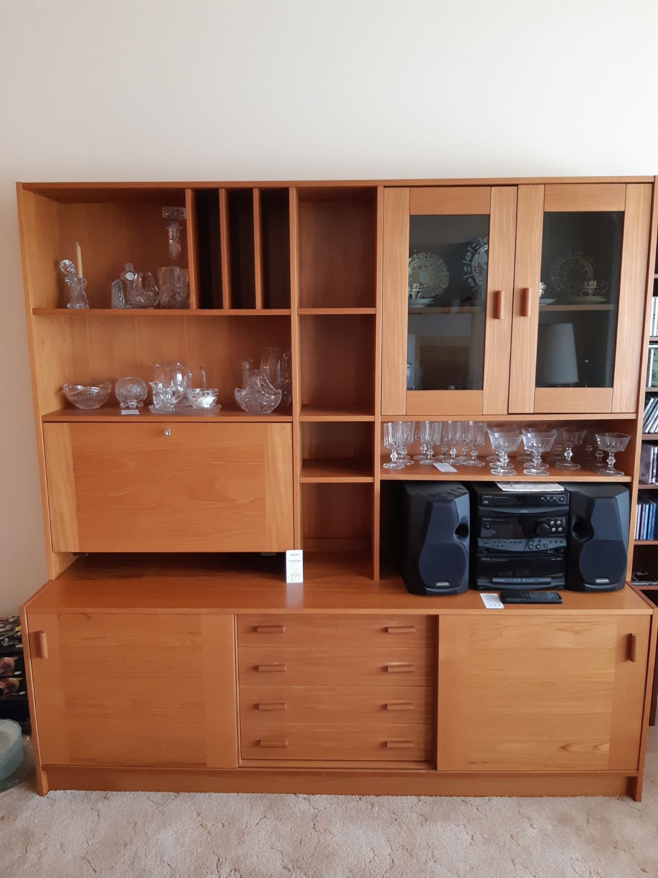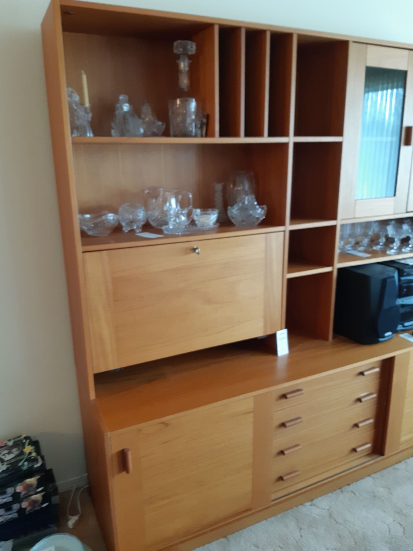 Wood and covered particle board wall unit, two pieces. 72x20x72. Contents not included. Bring help and appropriate vehicle to remove.pick up at 1:00 pm