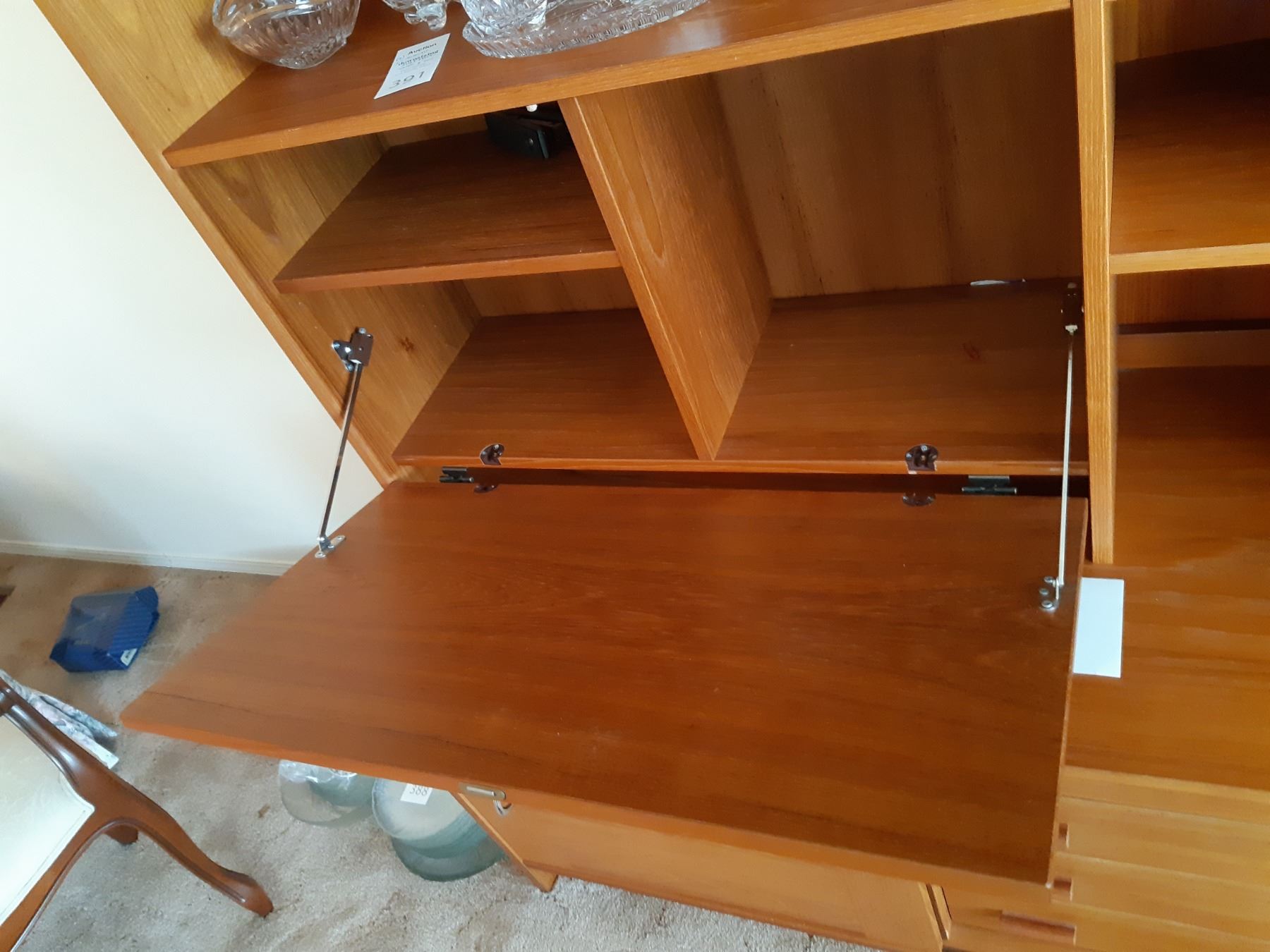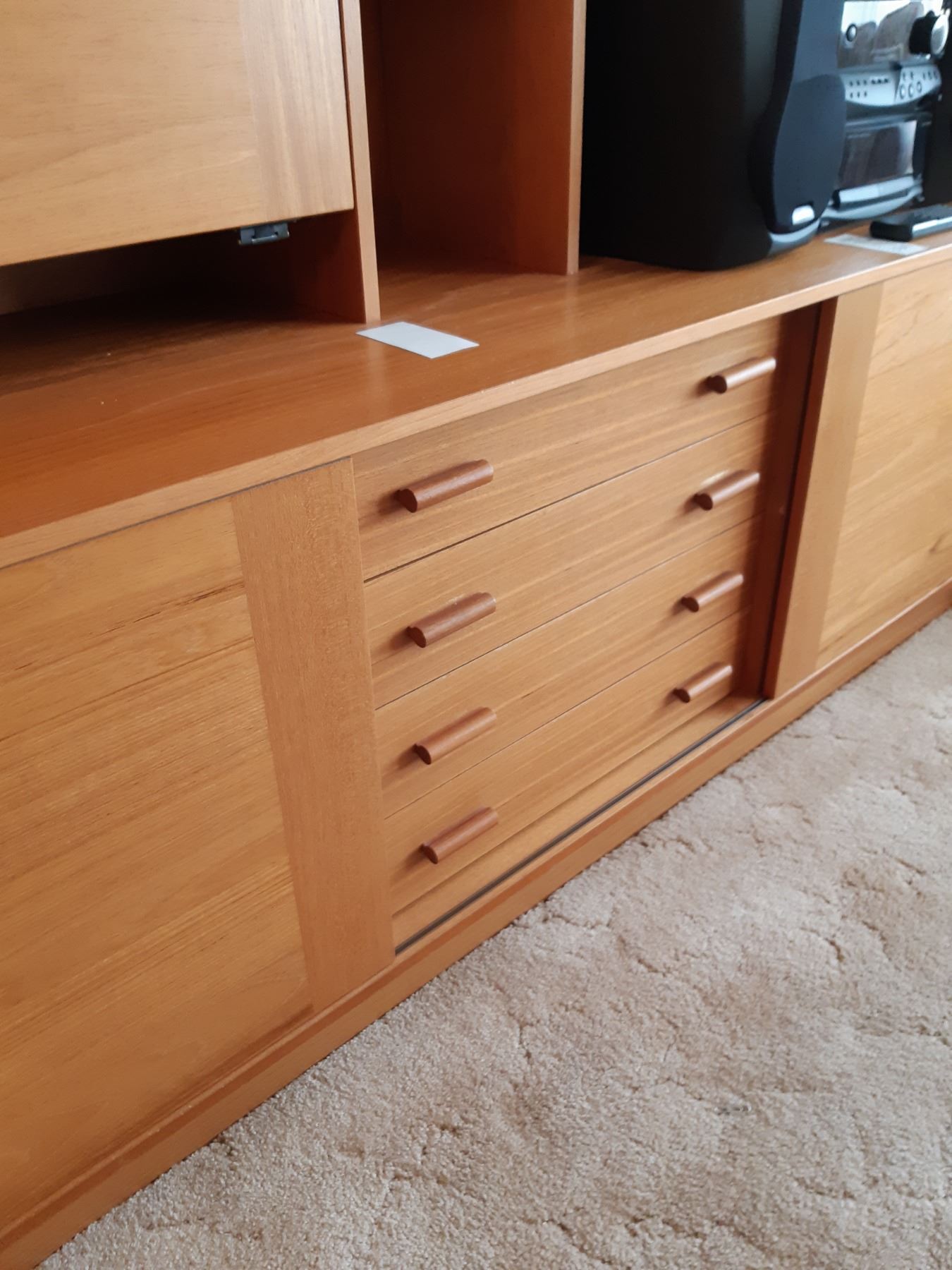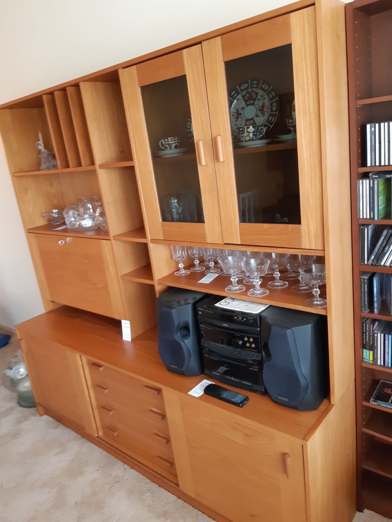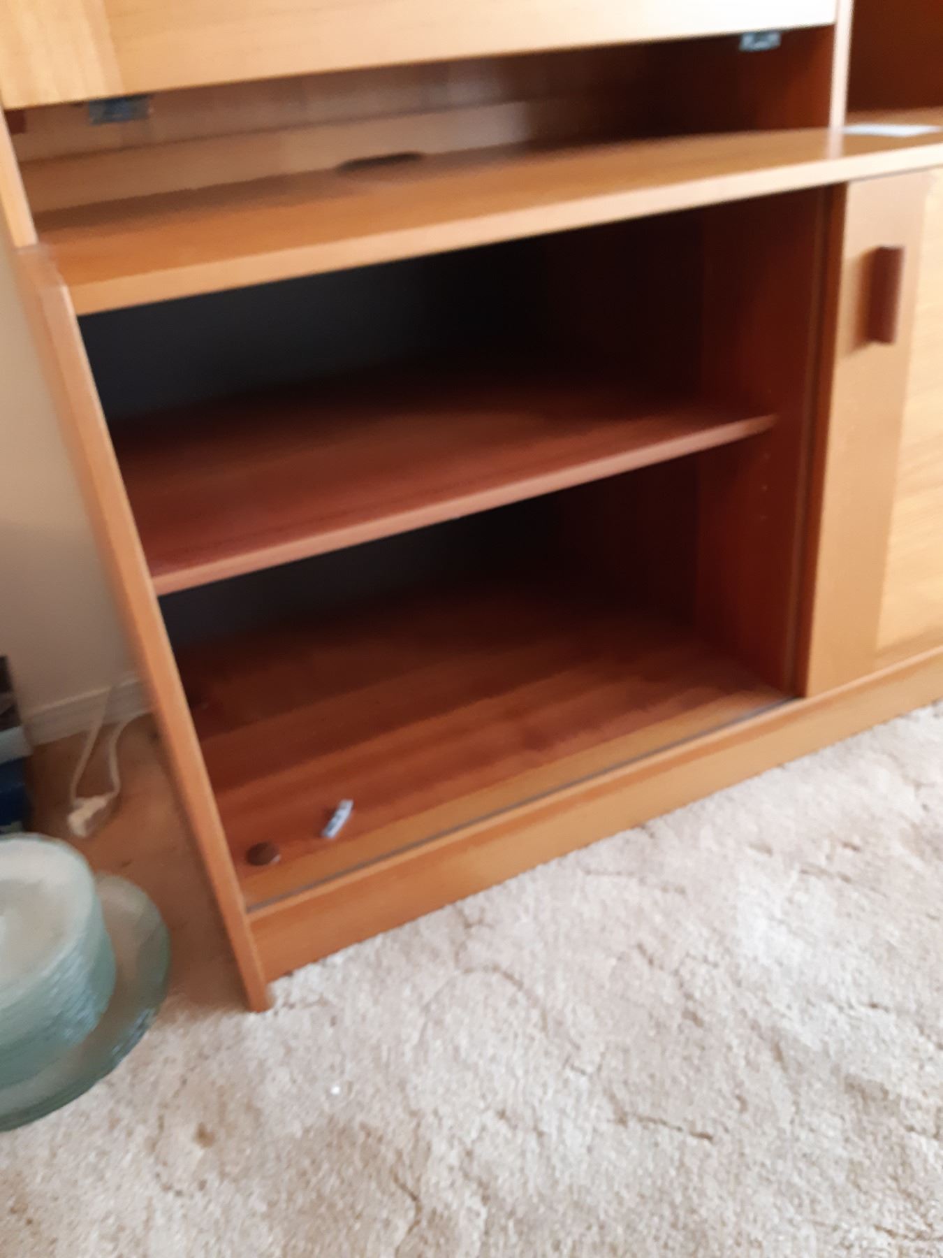 Wood and covered particle board wall unit, two pieces. 72x20x72. Contents not included. Bring help and appropriate vehicle to remove.pick up at 1:00 pm