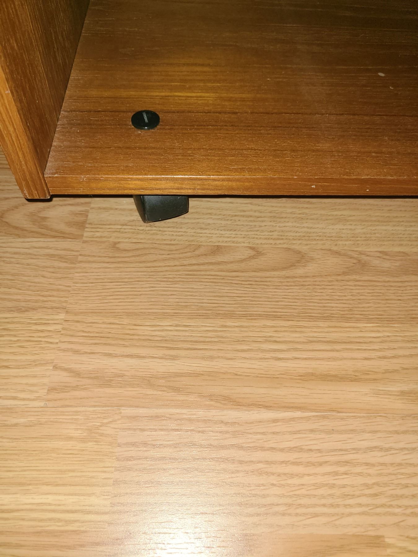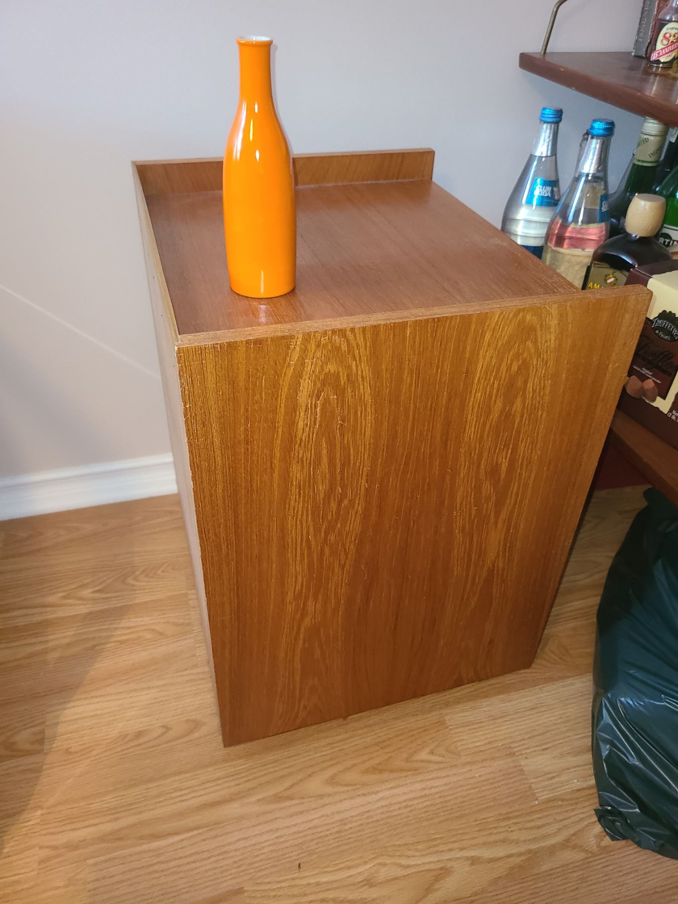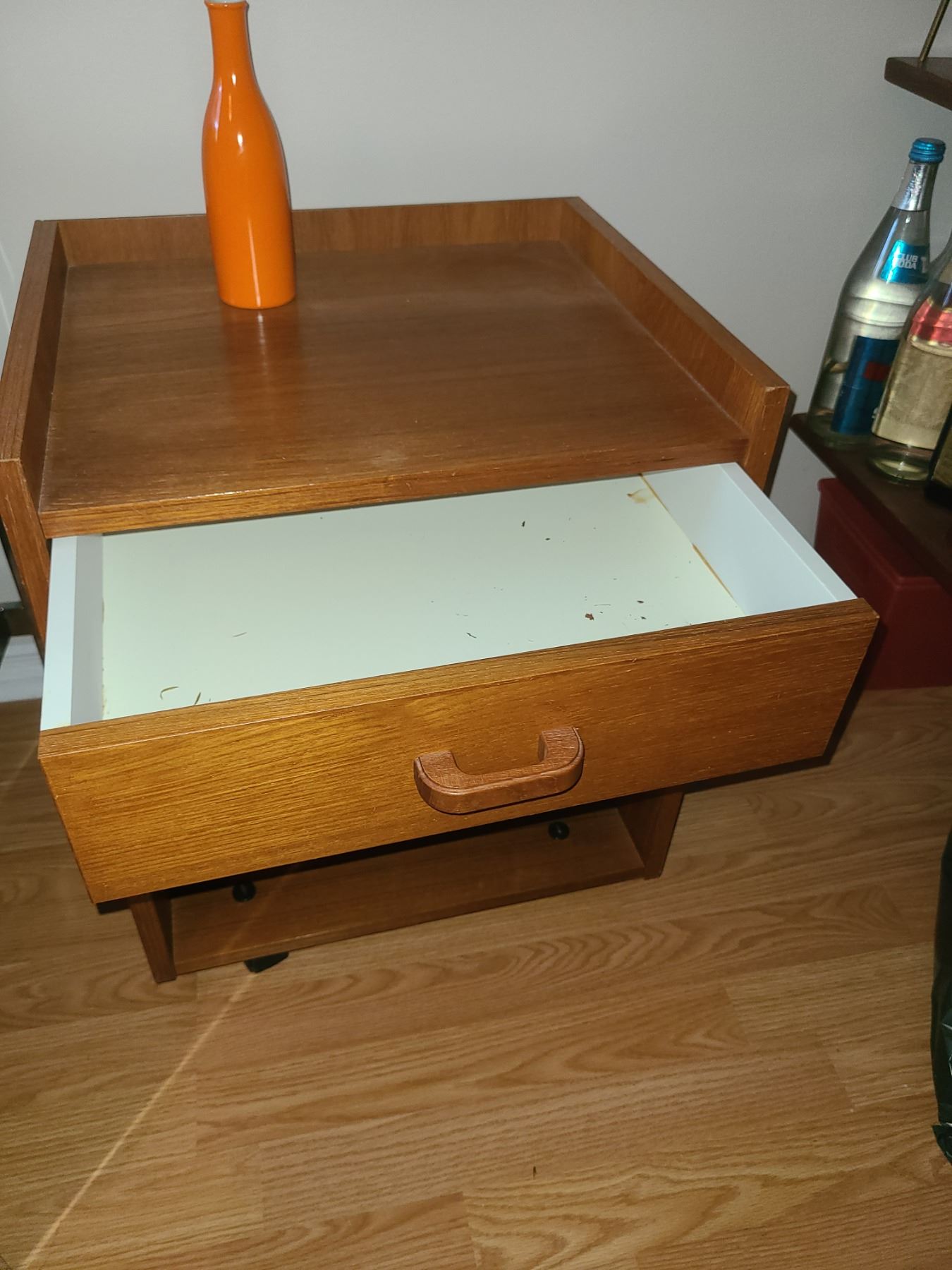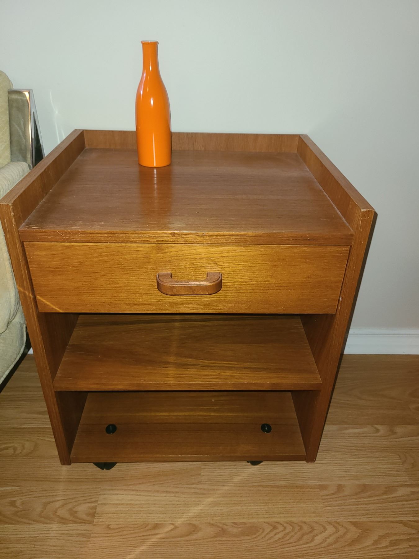 Teak table w/ decorative vase. 17x15x22”. Note water marks. Pickup 9am.