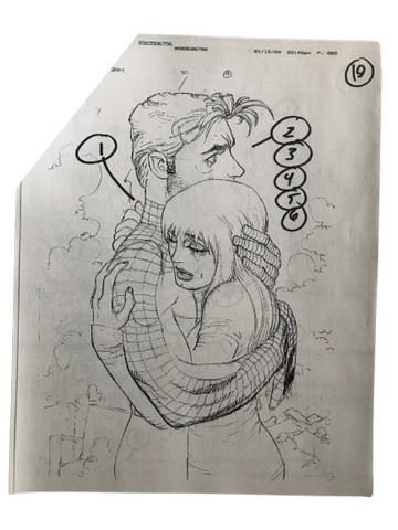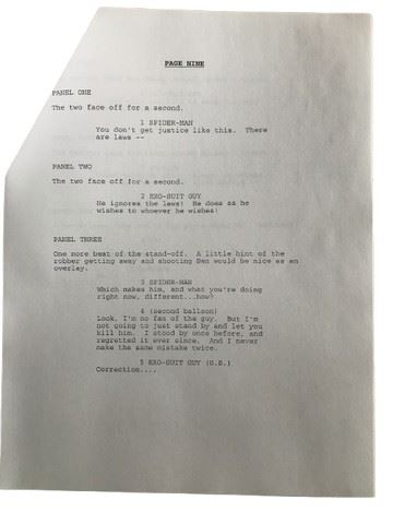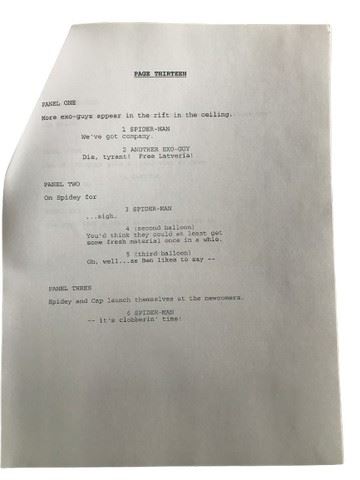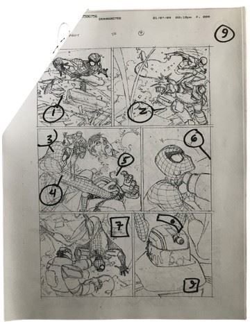 From the personal collection of J. Michael Straczynski, this is a hard copy of The Amazing Spider-Man #50 comic book in the production stages. Included is a memorandum from an employee at Marvel dated January 16, 2003. The memorandum discussed how they have plenty of time to adjust dialogue, captions, and sound effects for a smoother flow in the fight Scene. Also included is the comic book images with bubbles that are numbered as well as the full script that correlates with the bubbled numbers on the comic book production pages. Also include included is a four page printed review of this comic book that he had stored along with this memorandum and script. This rare lot details the behind the scenes steps of creating a comic book.