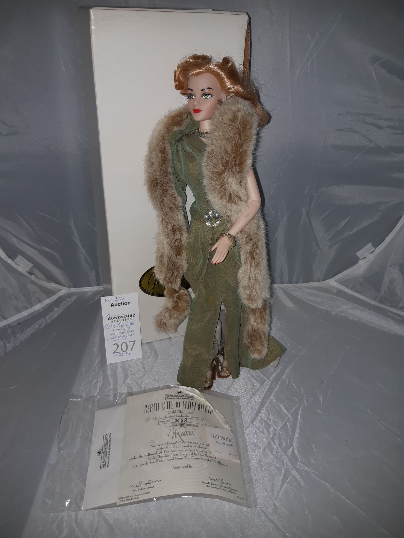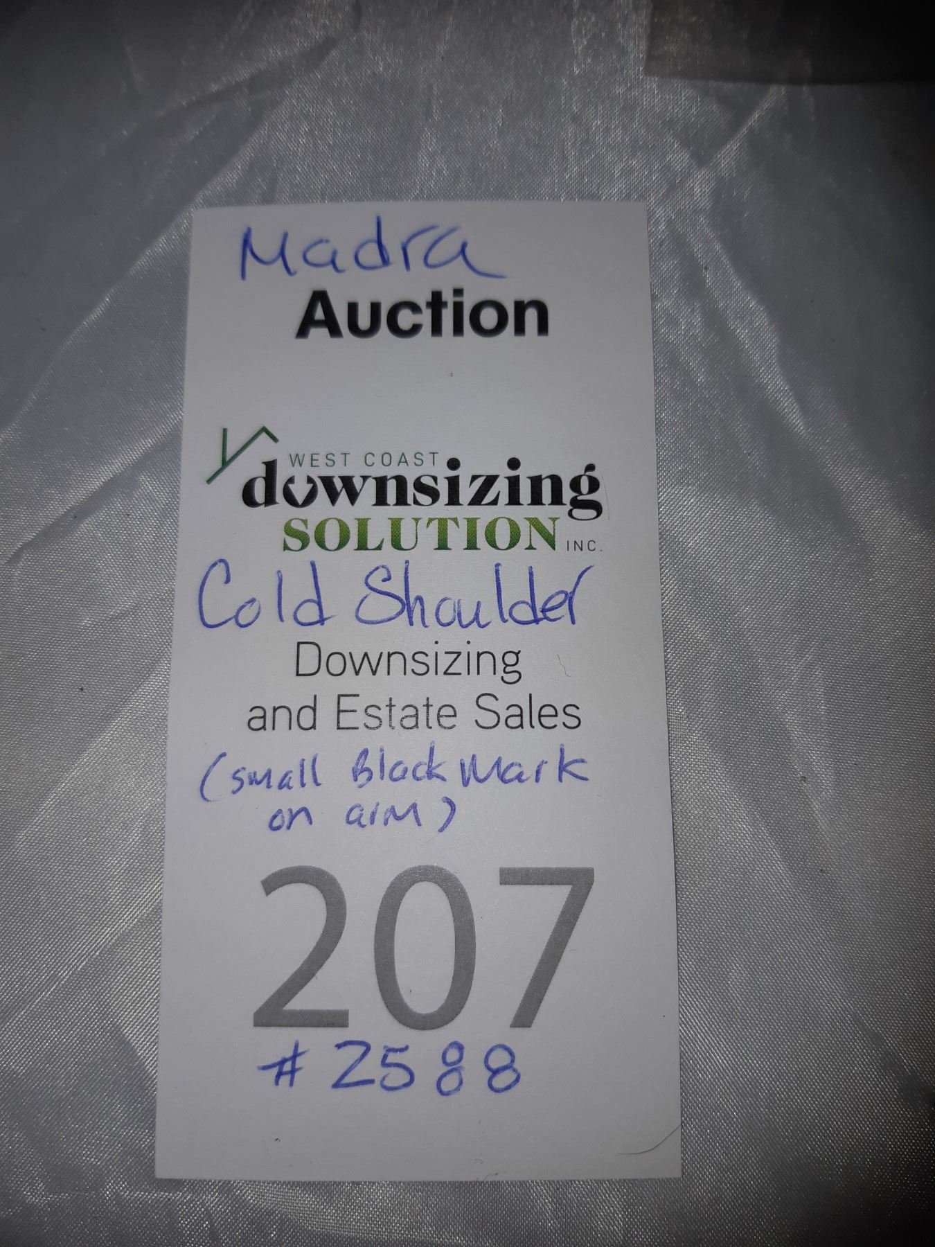 Madra, Cold Shoulder #2588, small black mark on arm. C of A in box Pickup at 9 am