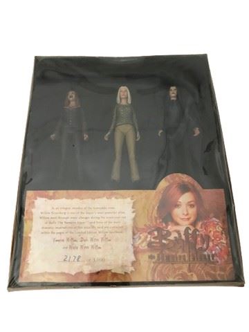 The “Buffy the Vampire Slayer” limited edition Willow’s Spellbook, an individually numbered deluxe action figure box set. This set was released in 2004 and includes three exclusive variant figures of Willow. Only 3,000 pieces were made worldwide. Each figure represents a different version of Willow from the series: