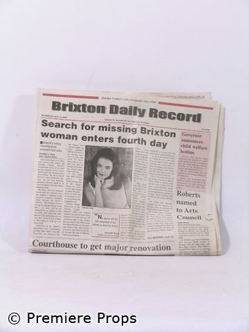 Paper copy of "Brixton Daily Record" newspaper featuring photo of Jessica King (Katie Holmes)