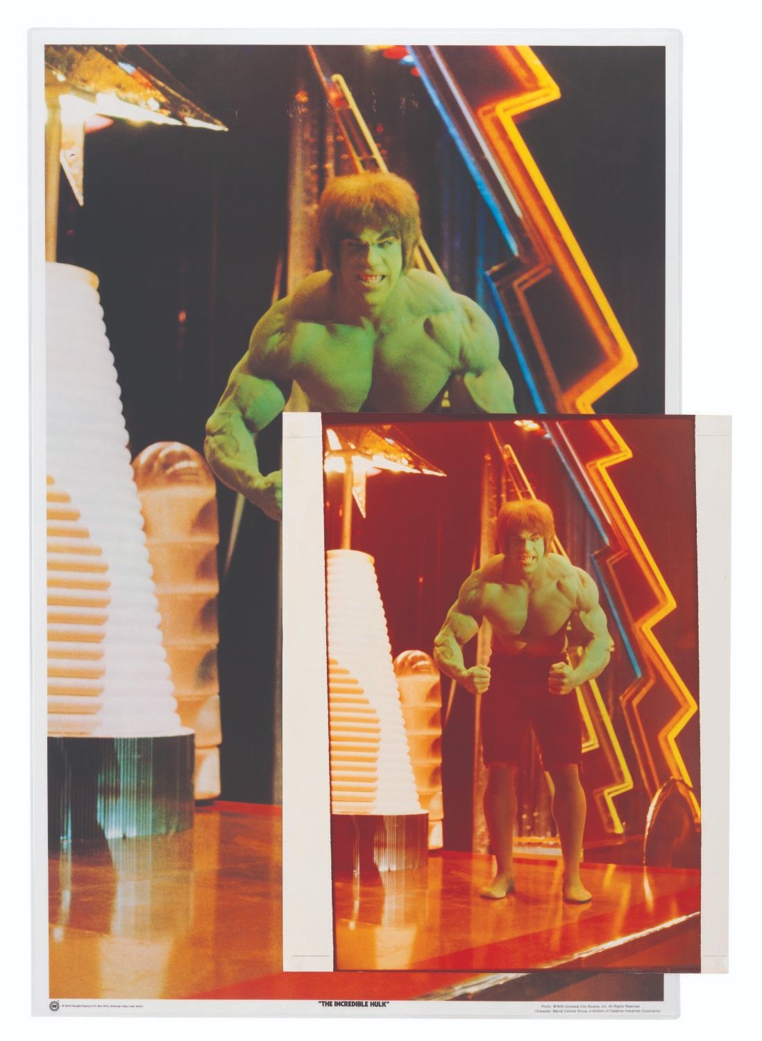 (Thought Factory, 1979) A rare laminated poster and a large poster development photo of Lou Ferrigno as "The Incredible Hulk." The poster was created in collaboration with Bill Wallen and Thought Factory, and it comes from Wallen's personal collection. The laminated poster measures 23.5" x 35.27" and the photo 16" x 20". Both are in good condition with scratches, light stains, wear at the corners of the photo, discoloration from age, and creases up to 16" on the poster.