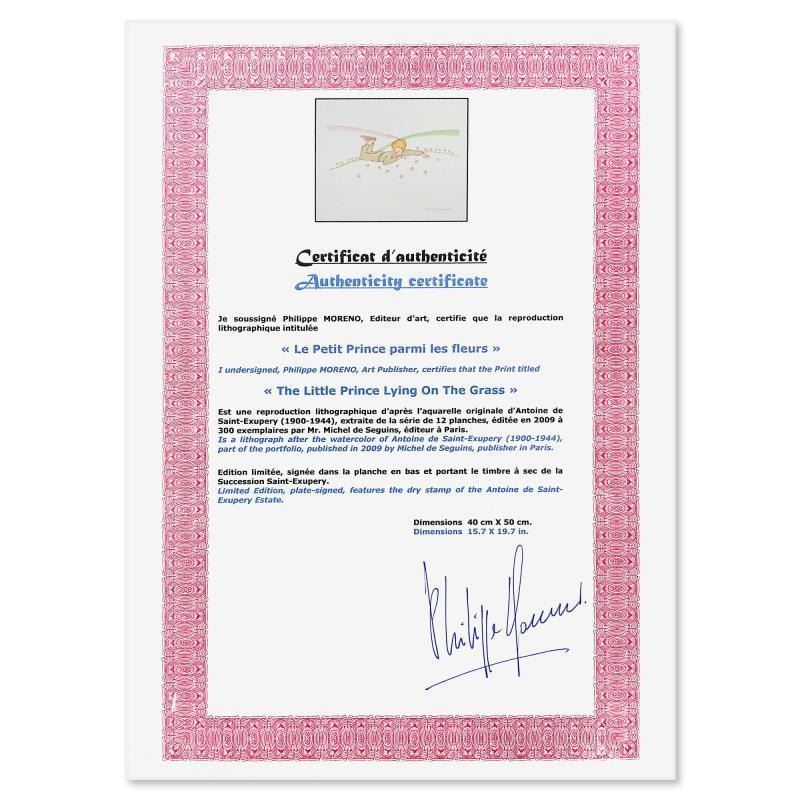 "The Little Prince Lying On The Grass" is a limited edition lithograph by Antoine de Saint-Exupery (1900-1944), bearing the plate signature of the artist. This piece comes from an edition of 300 authorized by the Exupery Estate, but the pieces in this edition are not individually numbered. This piece comes custom framed. Includes Certificate of Authenticity. Measures approx. 25.5" x 21.5" (frame), 19.5" x 15.5" (image). This item requires special handling and may have a longer than usual turnaround.