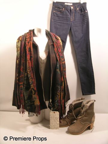 Stephanie (Kyra Sedgwick) screen worn, hero, black and brown zip up the front jacket, olive v-neck cashmere 'Community' sweater, (size XS) light pink with lace 'Talua' camisole, (size XS) multicolor scarf, medium blue was 'J. Brand' jeans, and tan suede and leather with wood heal boots. Includes wardrobe tag!