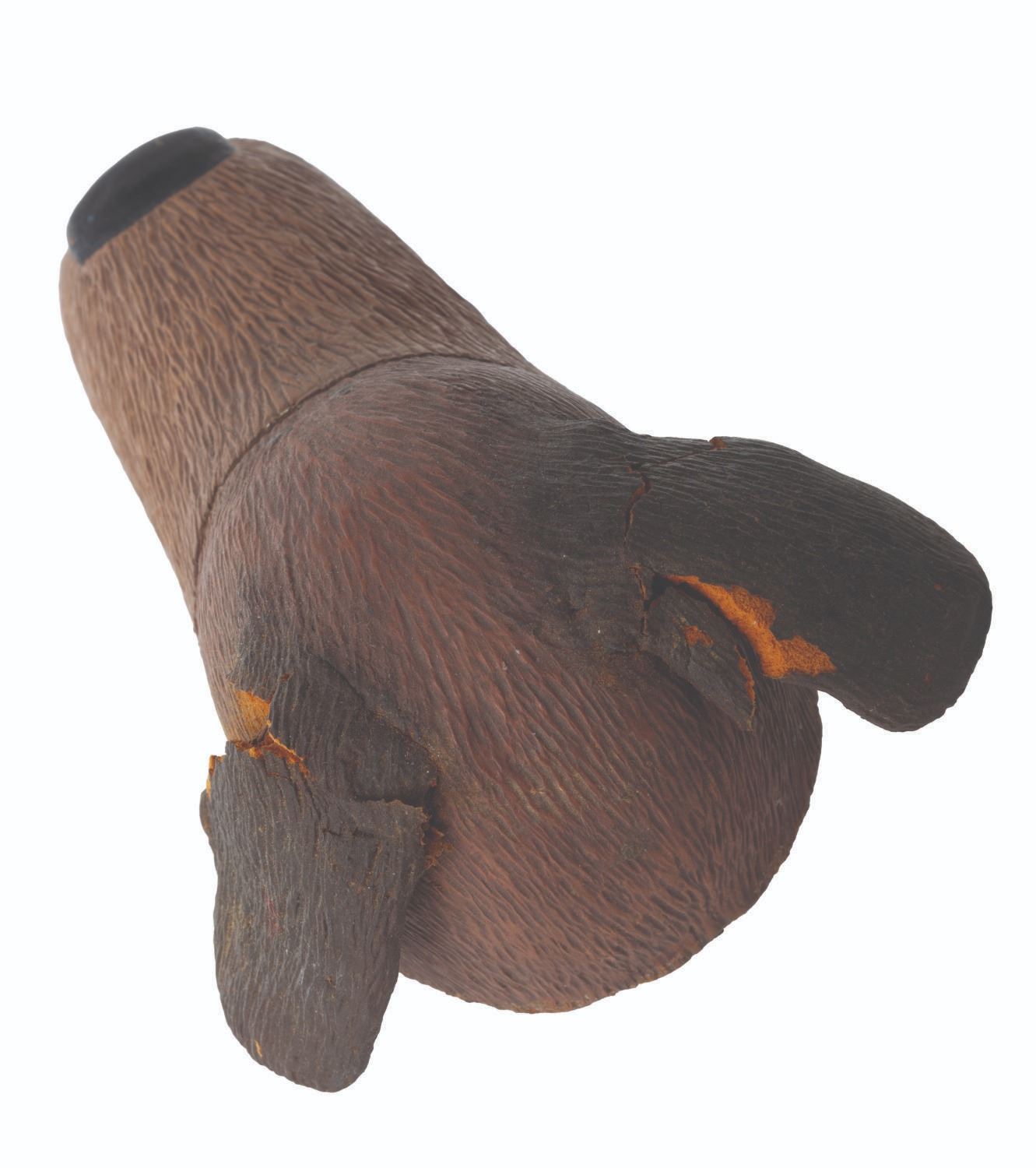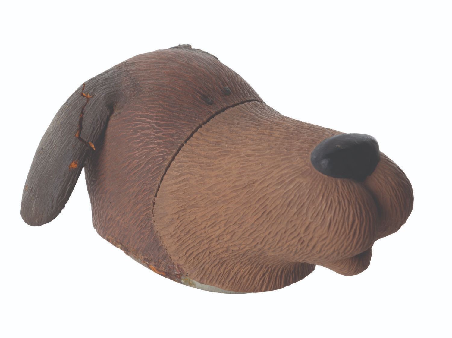 (New Line Cinema, 1996) A screen-used original stop-motion dog puppet head from the John Landis-directed film"The Stupids," starring Tom Arnold. While the film was live-action, the Stupids' pets were realized on screen via stop-motion animation. Measuring 4.5" x 5.5" x 3.25" tall, the resin and foam puppet head displays in good condition with heavy cracks on the ears, separation between the upper head and muzzle, and heavy material loss on the ears, scuffs, its original eyes missing, and wear from production use.