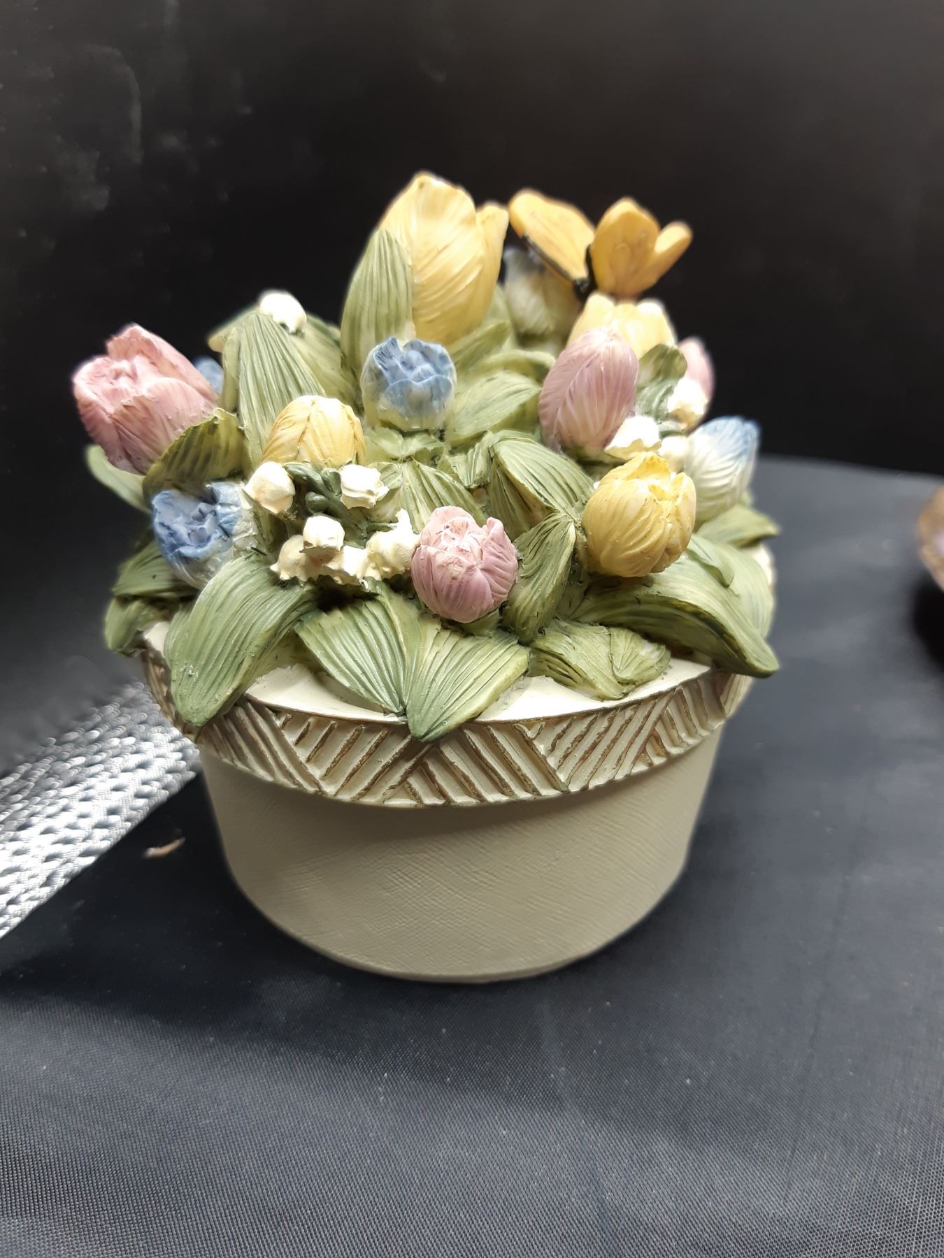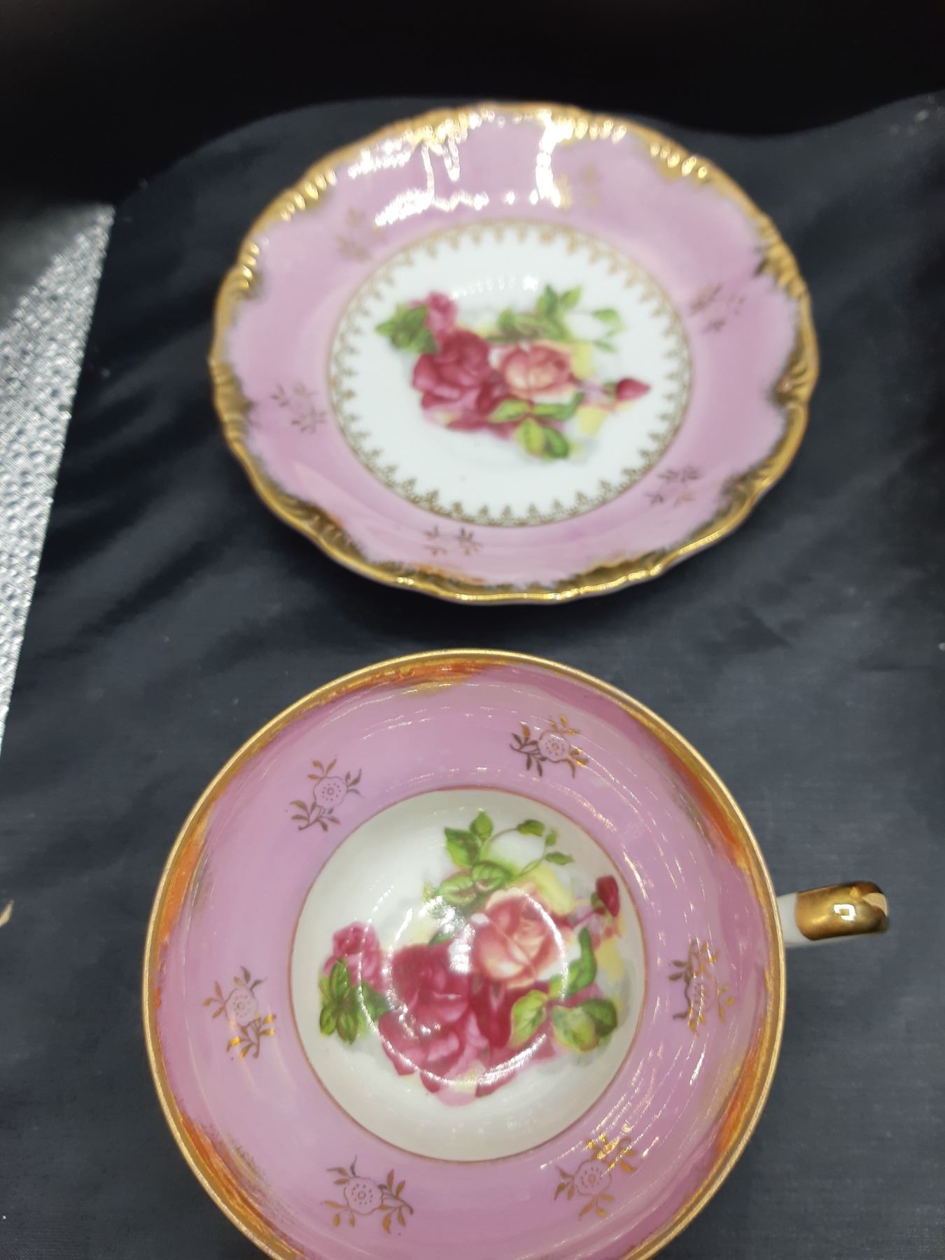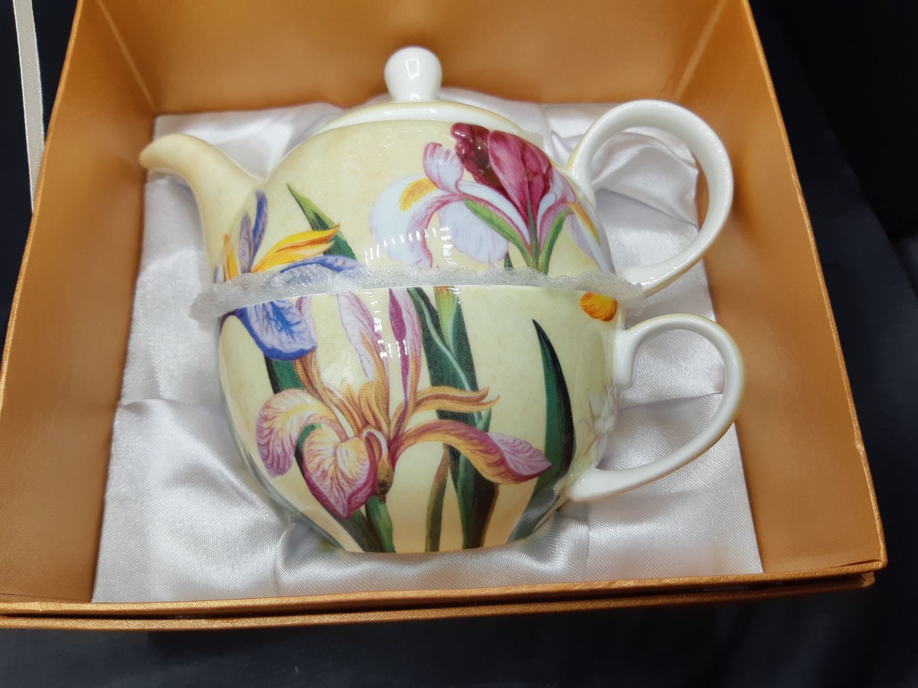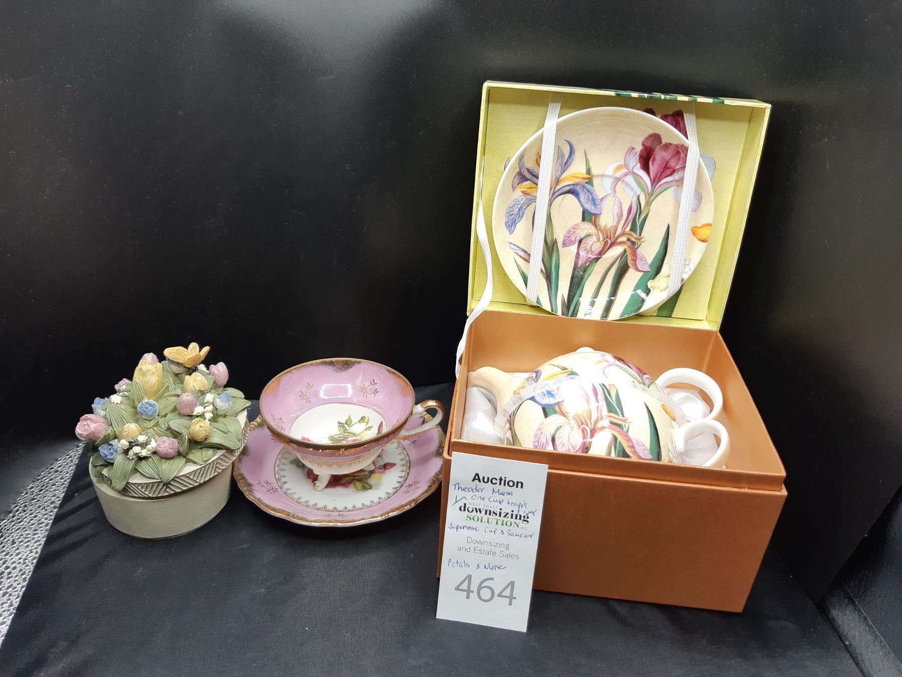 Teapot and cup and saucer for one in presentation box. Bone china teacup and saucer from Japan and Petals & Morne container. Pickup at 10 am
