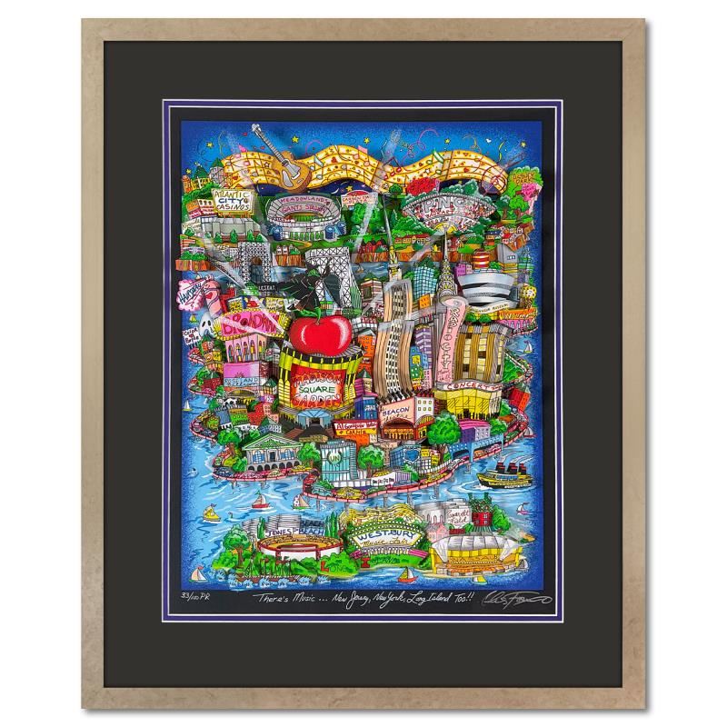 There's Music: New Jersey, New York, Long Island Too!! is a 3D limited edition silk screen construct on paper by Charles Fazzino, numbered and hand signed by the artist. This piece comes custom framed. Includes Certificate of Authenticity. Measures approximately 22.5 x 27.5 (framed), 15 x 20 (image).
