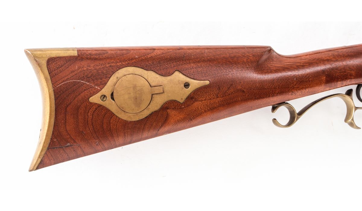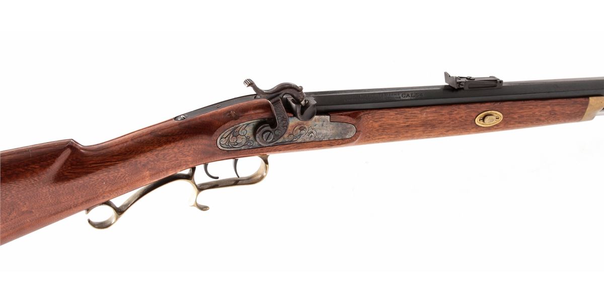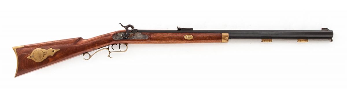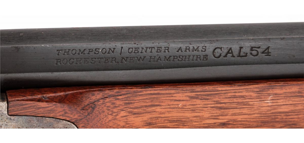 Thompson Center Percussion Target Rifle, #217022, .54 cal., 29'' octagonal barrel, walnut stock, brass furniture, double set trigger, with standard front and rear sights. Condition is excellent showing just light range use and scuffs and scratches to buttstock. Good functioning set trigger. Est.: $250-$400. (Antique)