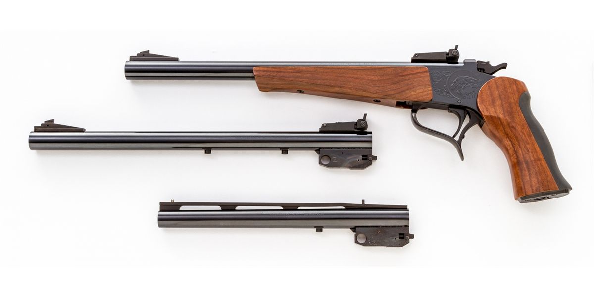 Thompson Center Contender Single Shot Pistol, #391514, .223 Rem. cal., Super 14'' barrel, blue finish, walnut pistol-grip with rubber backstrap and walnut handguard, in original box with two extra barrels (.30-30 Super 14''; and .45 Colt 10'' bull) all in their original boxes. Condition is excellent. All components show very little use and possibly being unfired. Est.: $750-$1,000/set. (Modern)