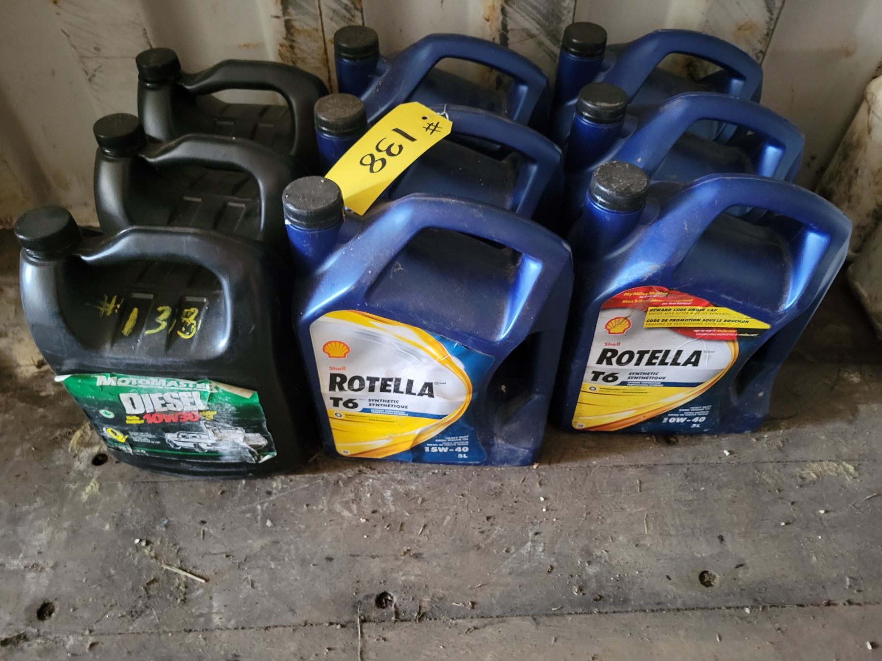 Three 10W-30 diesel oil, 2 unopened, 1 open 1/4 full; 3 jugs 15W-40 diesel motor oil, unopened, 3 0W-40 diesel motor oil, unopened
