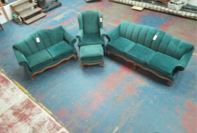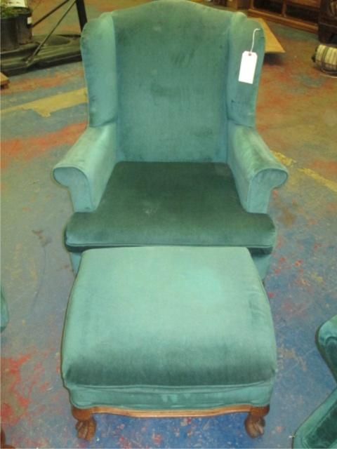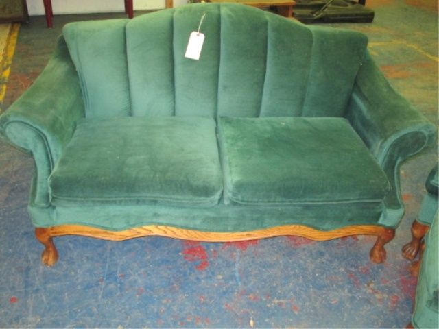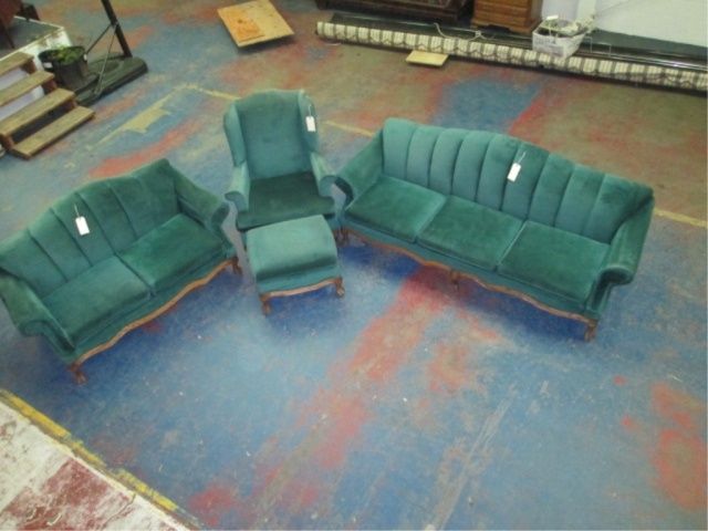 Green Velvet Wood Trim With Elegant Wood Carved Claw Ball Feet Set Includes: Sofa, Love Seat, High Back Throne Chair And Ottoman