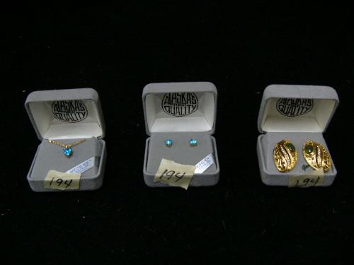 Three pieces of jewelry: Arctic Ice earrings and necklace; jaded earrings