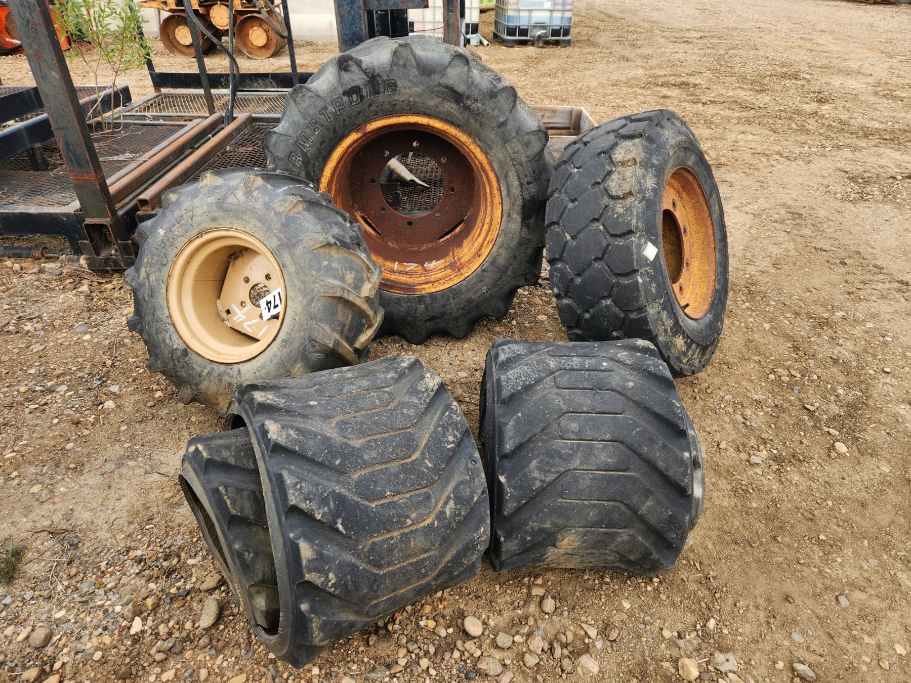 Three tires, One 26x12.00-12, One 33x18.00-20, One 12x16.5 and Two pieces of rubber matting