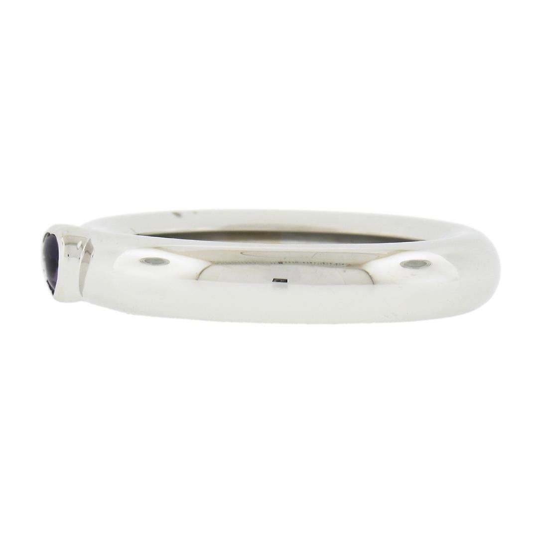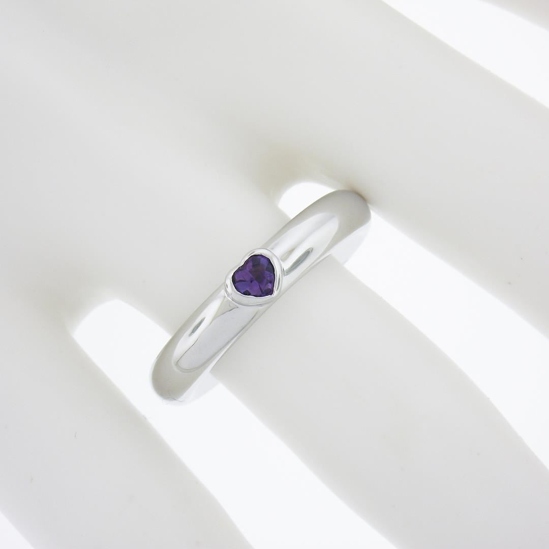 A solid 18k white gold solitaire ring by Tiffany & Co. with 1 heart cut natural amethyst. The ring is size 6.5, weighs a total of 5.07 grams, and measures 4mm wide.