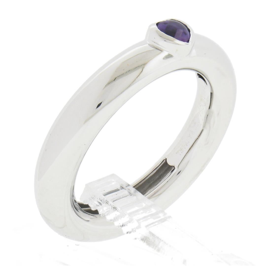 A solid 18k white gold solitaire ring by Tiffany & Co. with 1 heart cut natural amethyst. The ring is size 6.5, weighs a total of 5.07 grams, and measures 4mm wide.