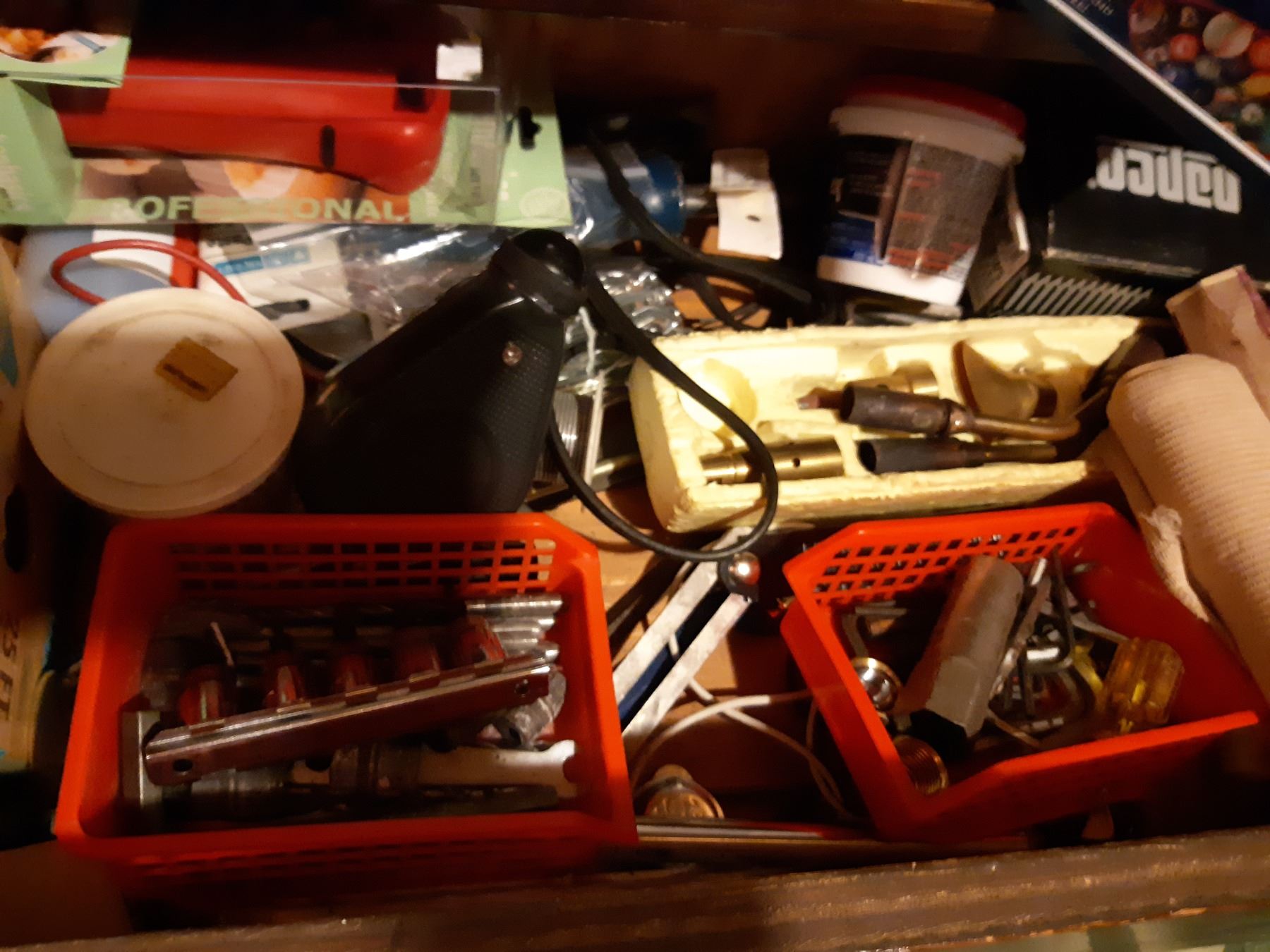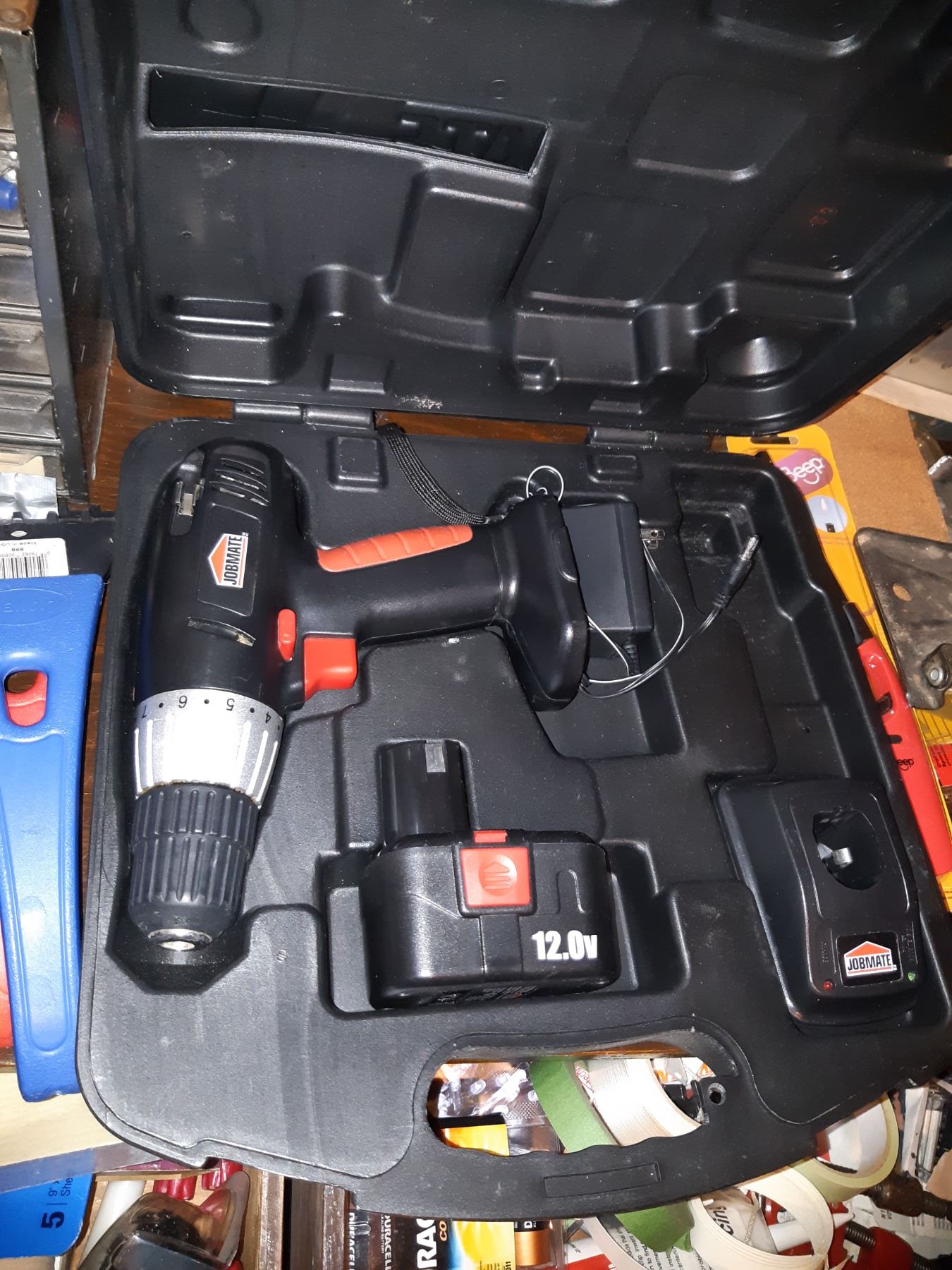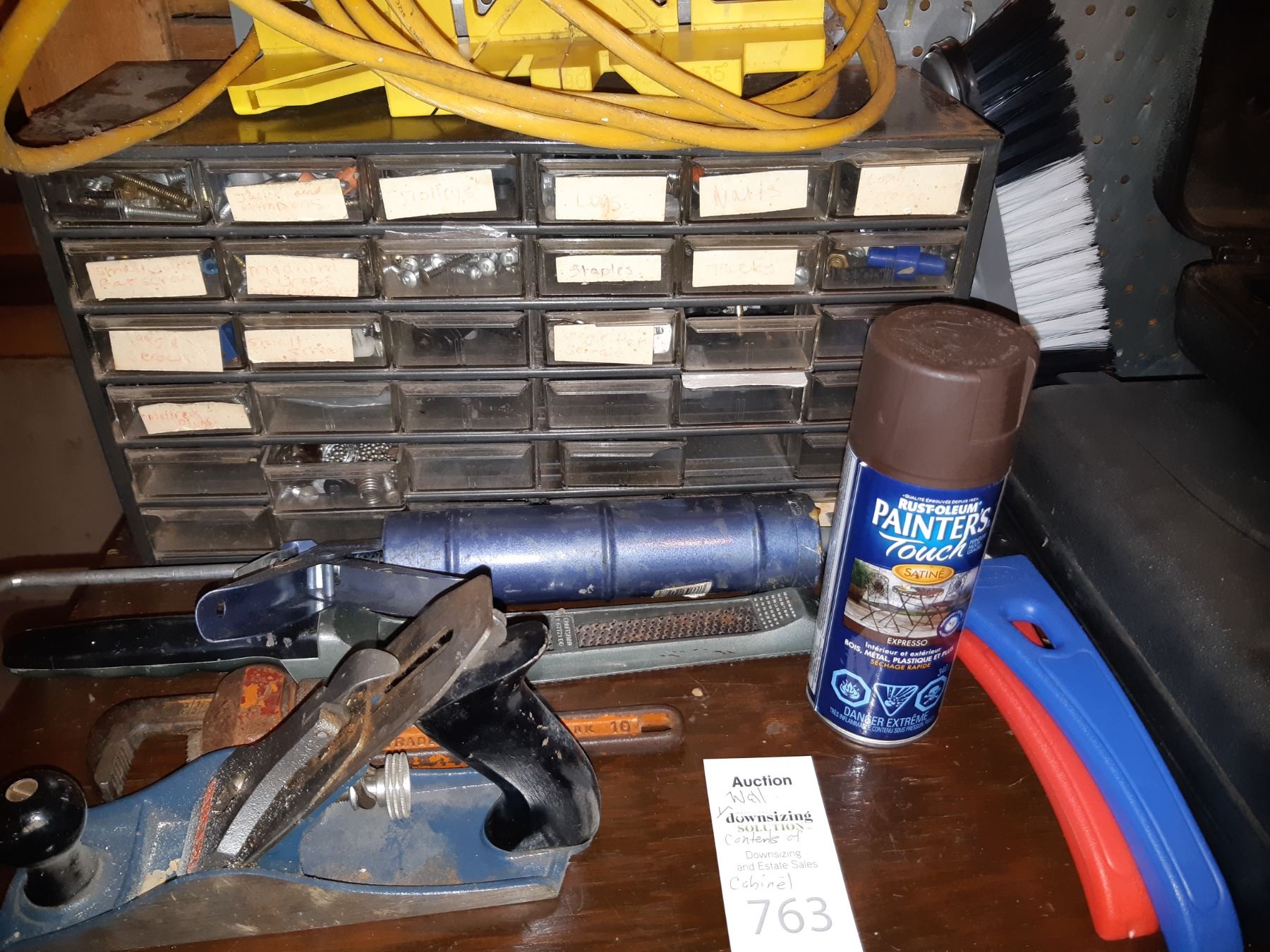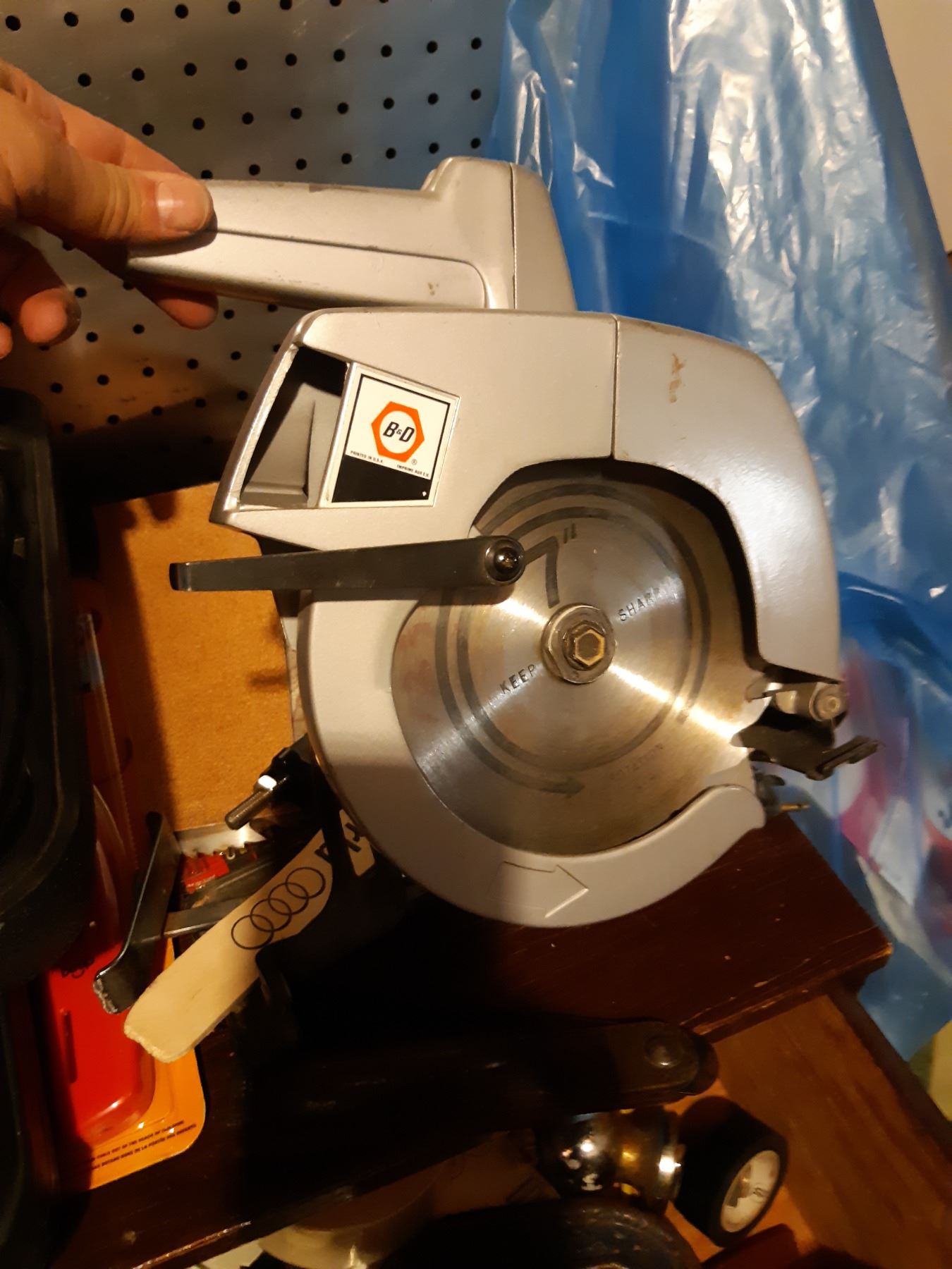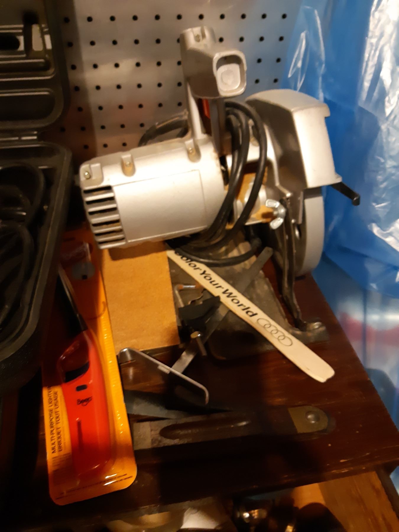 Craftsman, Jobsmate drill with battery pack and charger, B&D circular saw, untested.planes, contents of wall and drawers of cabinet. Bring packing materials and pickup at 10 am