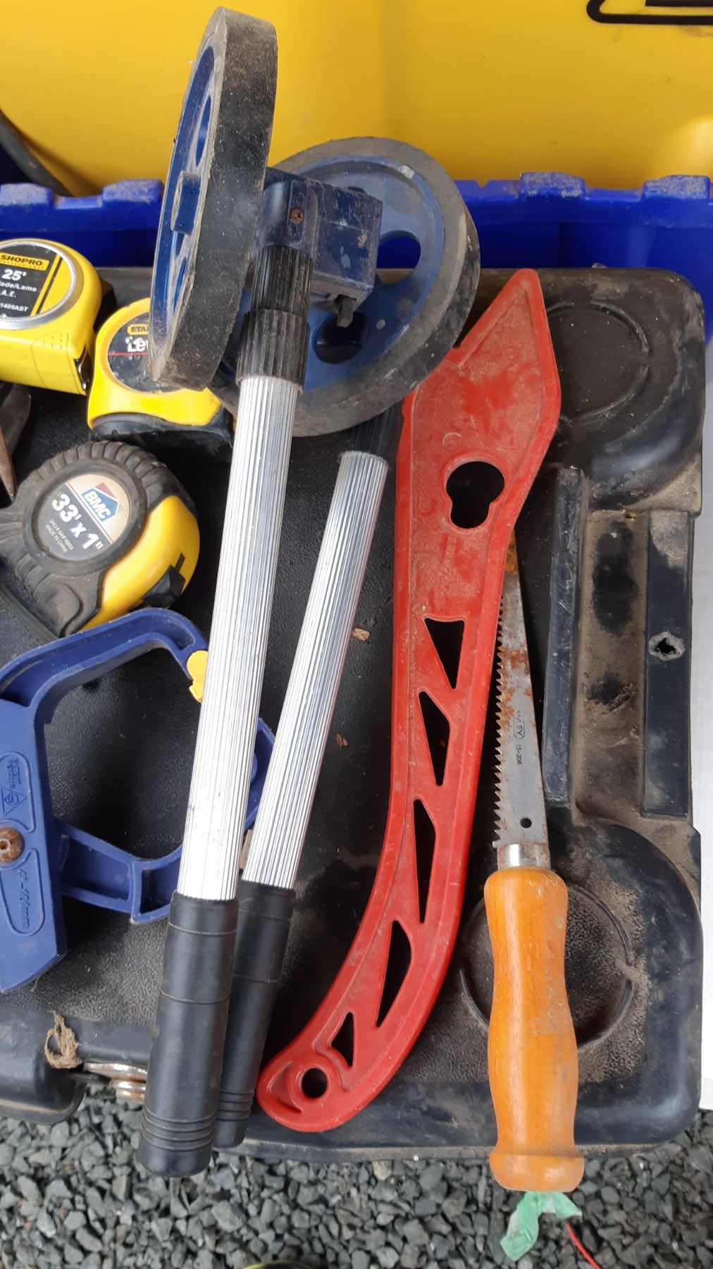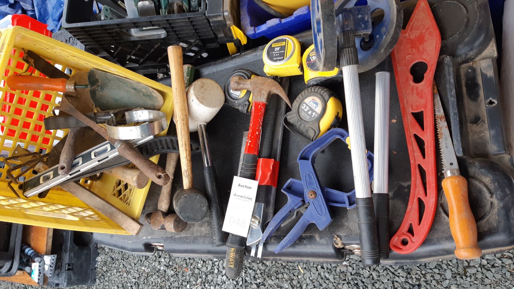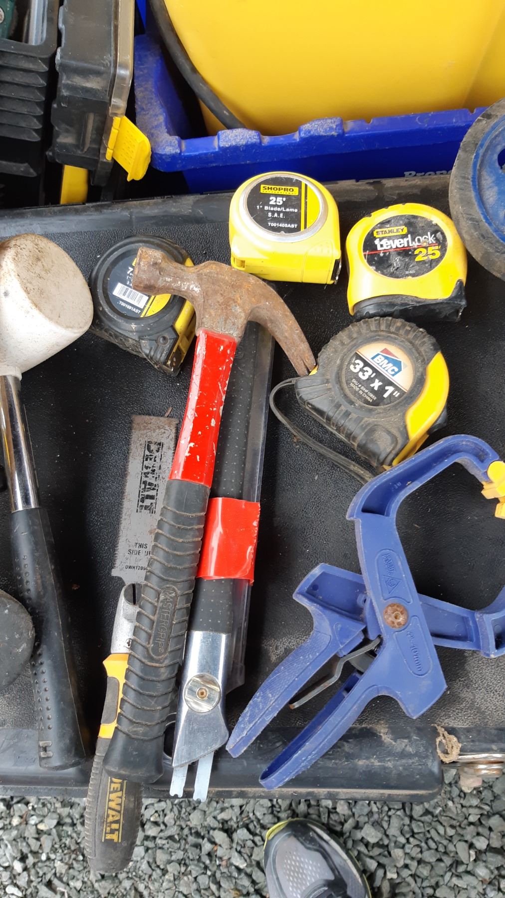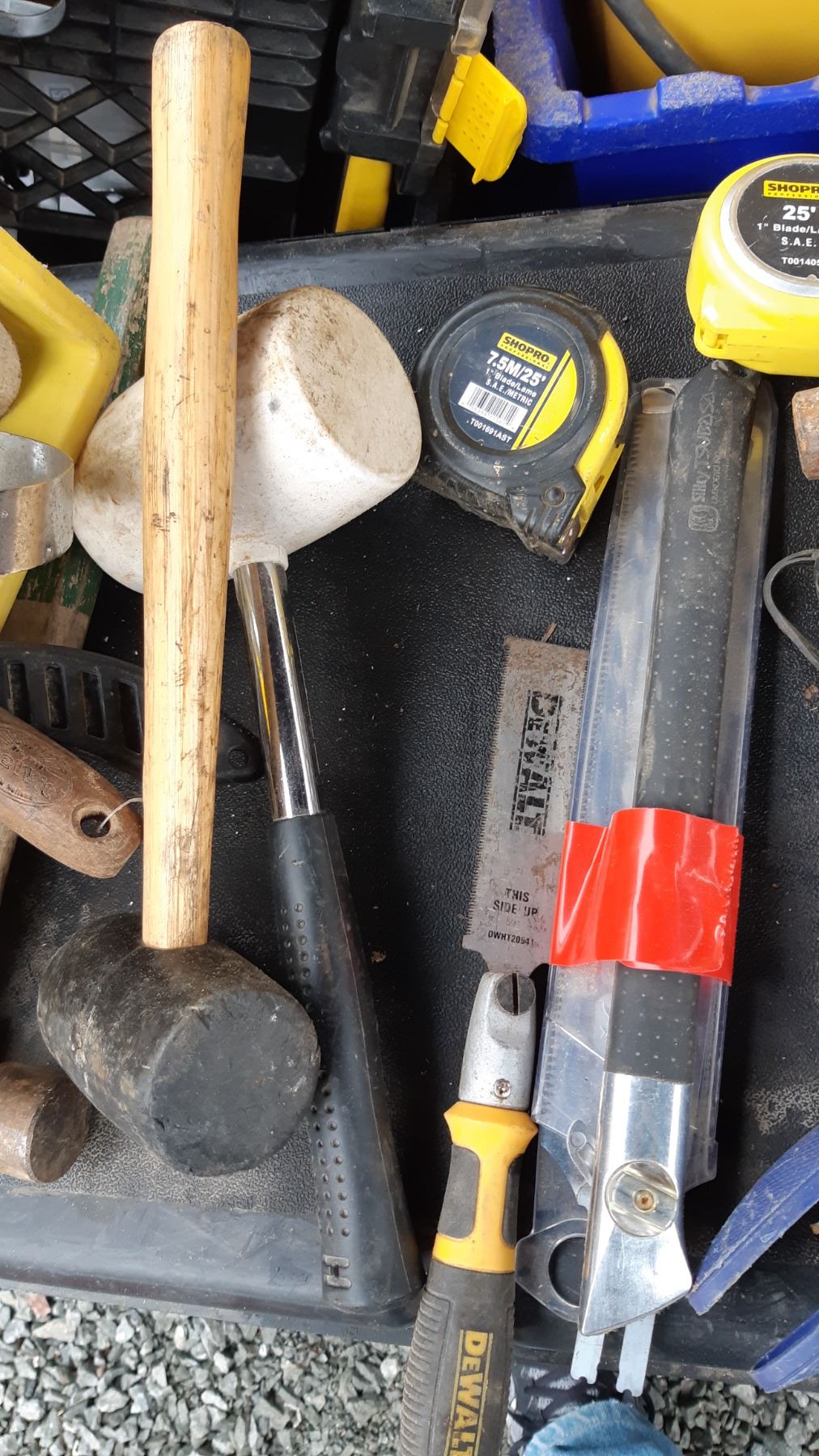 Assortment of hamnmers, levels, mallets, calipers, measuring tapes & more. Pickup at 11 am