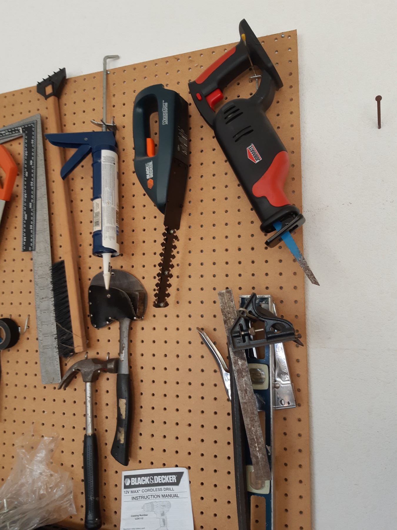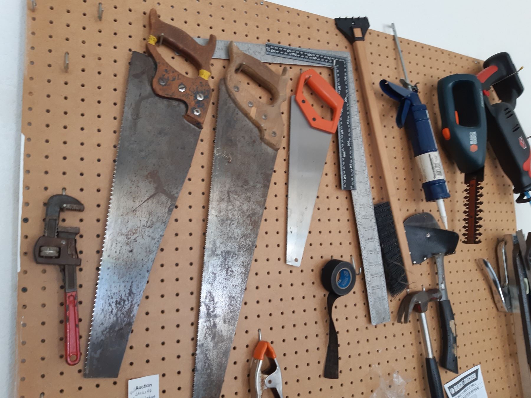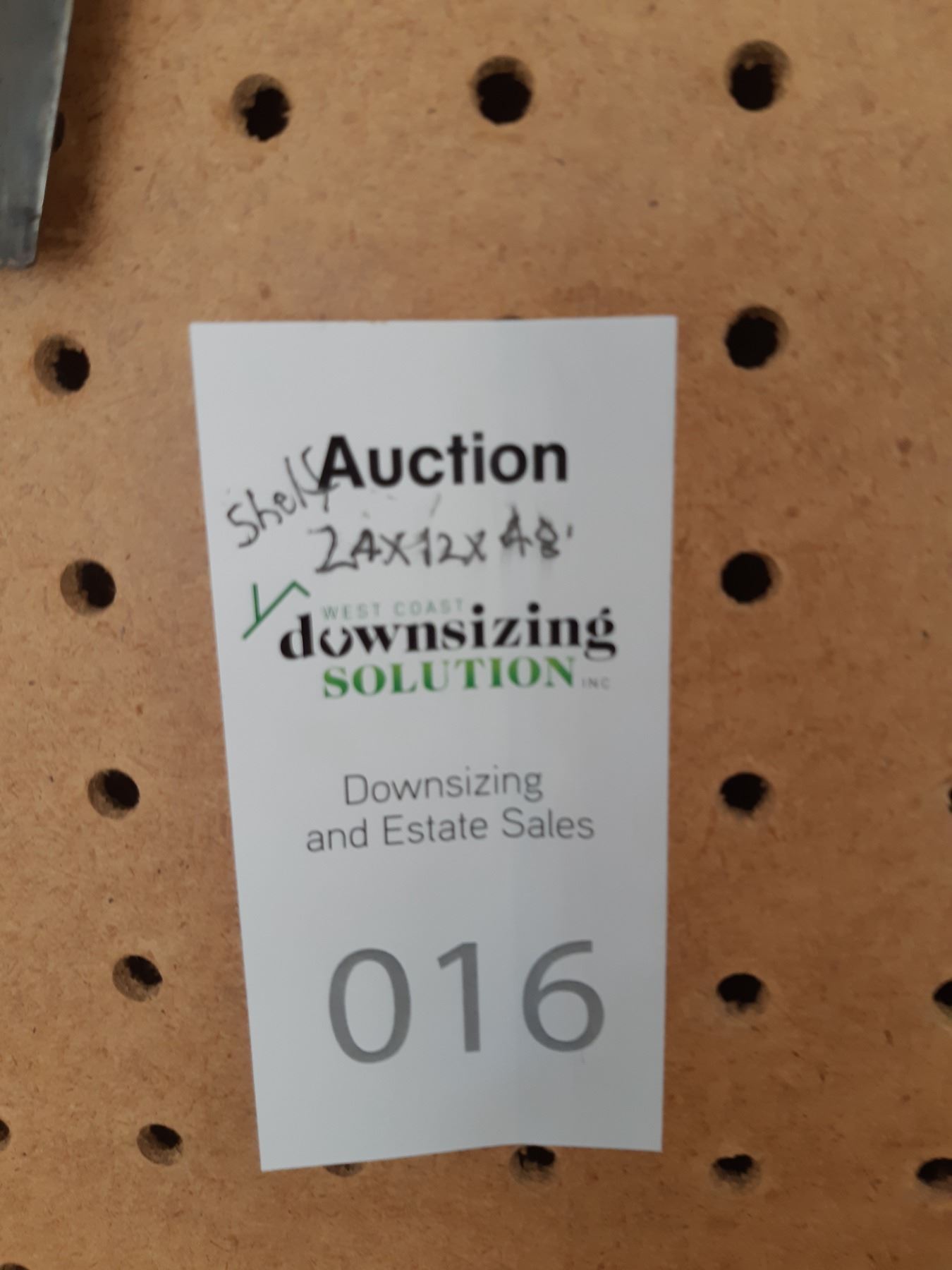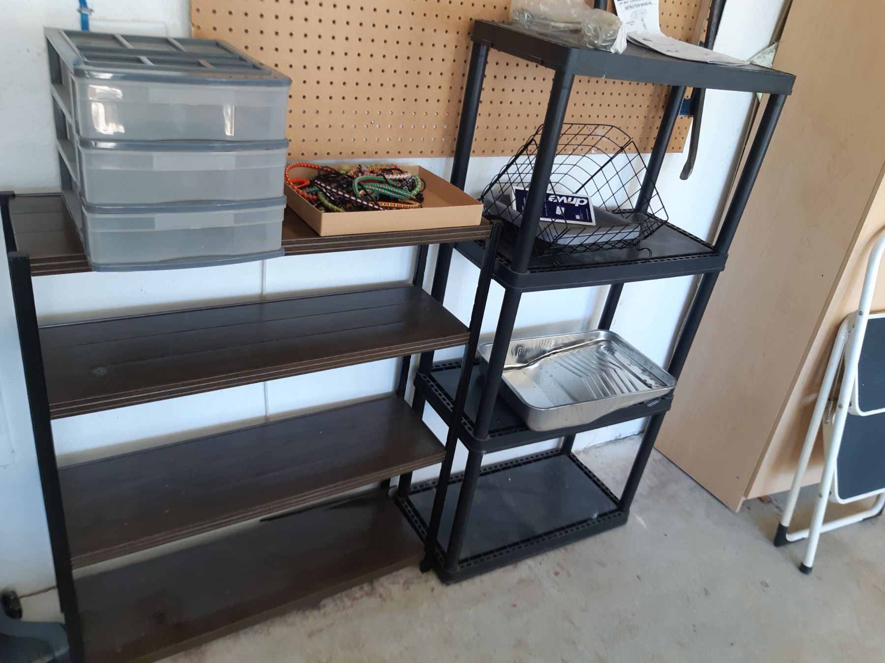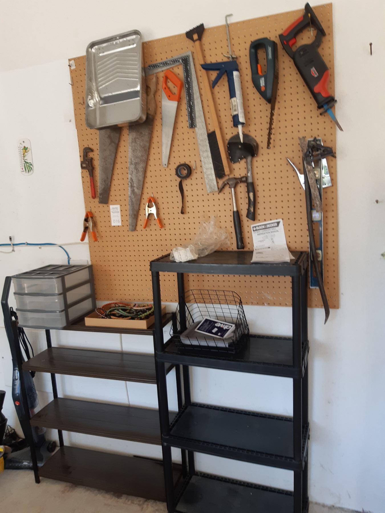 Portable shelving 24x12x48. Metal shelving includes contents and tools on wall. Bring packing supplies and pickup at 9 am