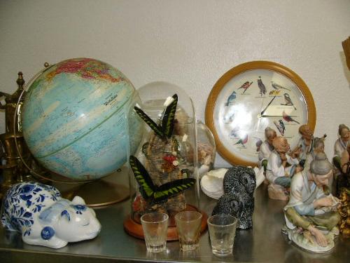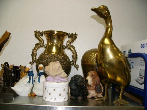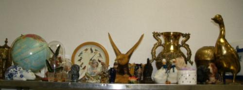 Top shelf consisting of: figures, shells, brass pots, cat, clock, huge brass duck, carved wood eagle (227)