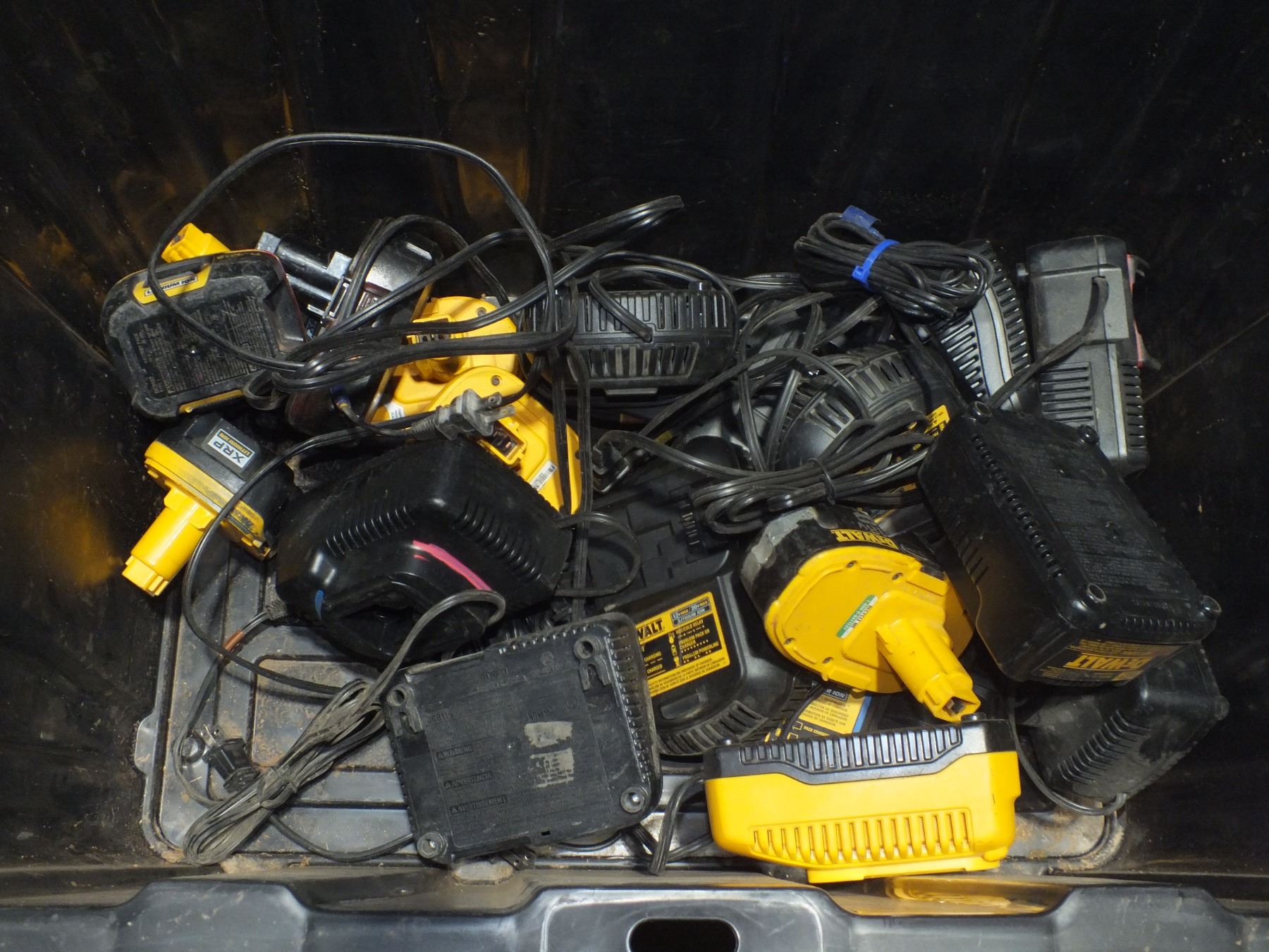 Tote Of Assorted Dewalt Chargers & Batteries, all untested...used