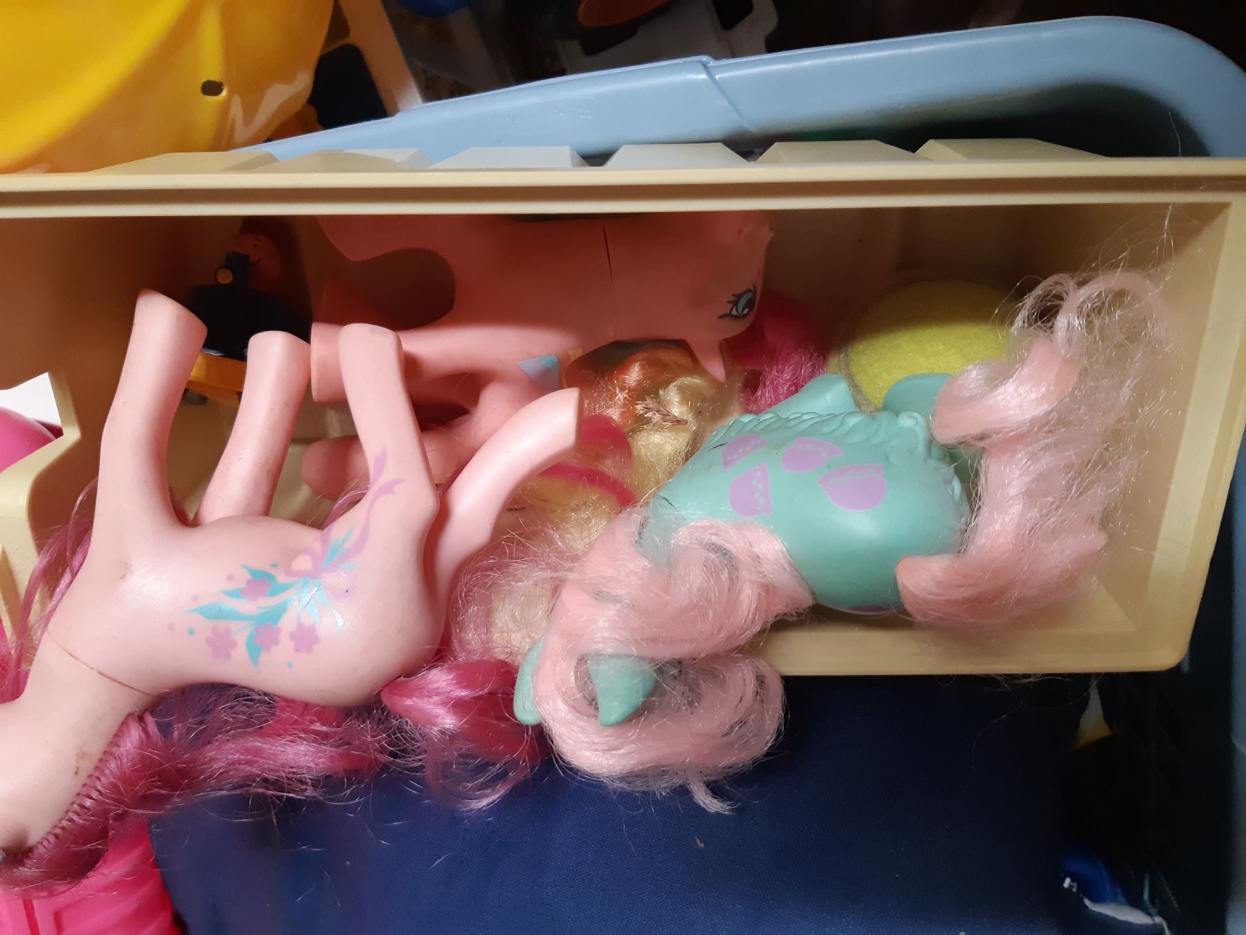 Large assortment of toys, my pony, McDonald toys, crib, toy case with wheels and more. Bring packing supplies and pickup at 9am