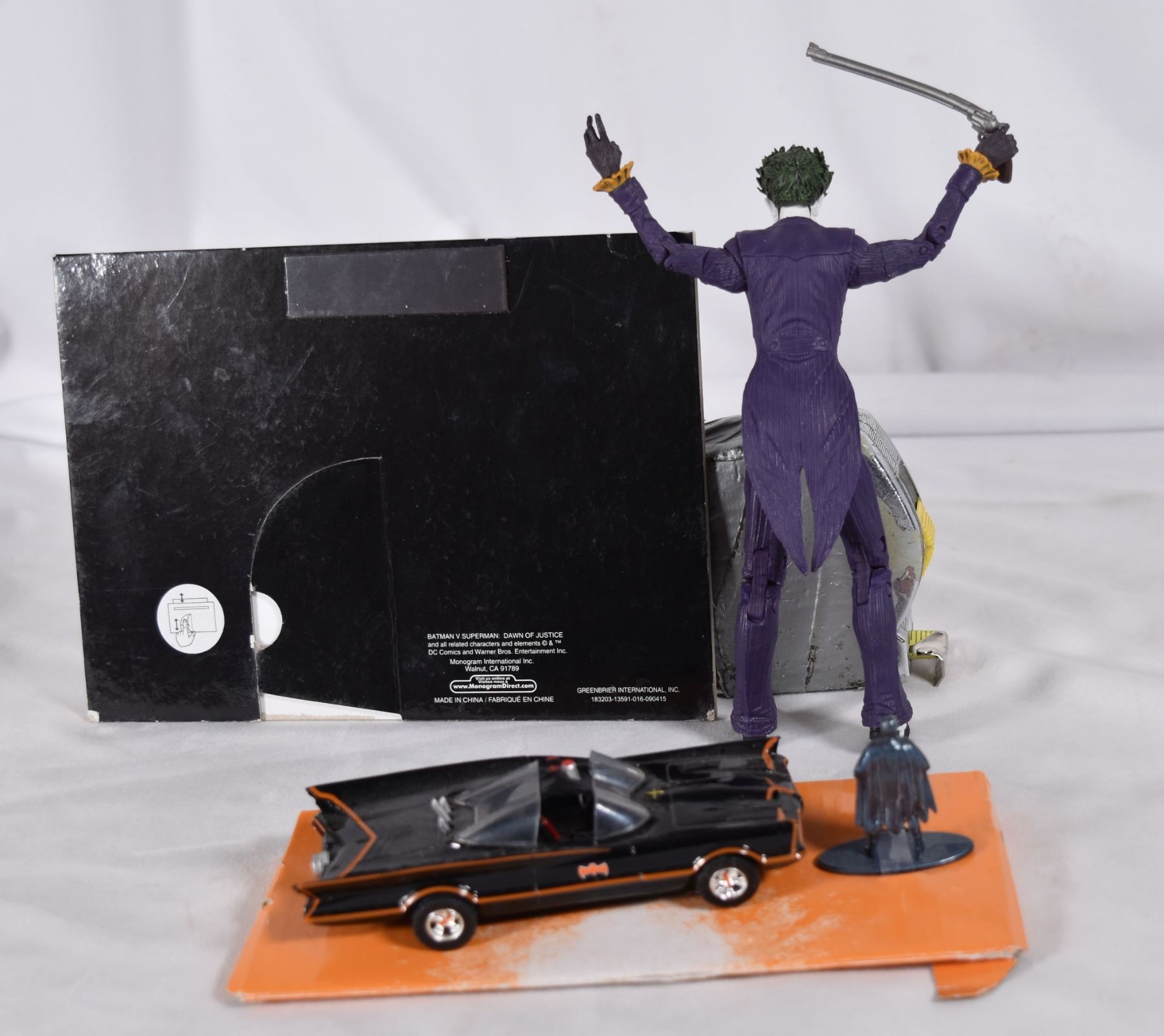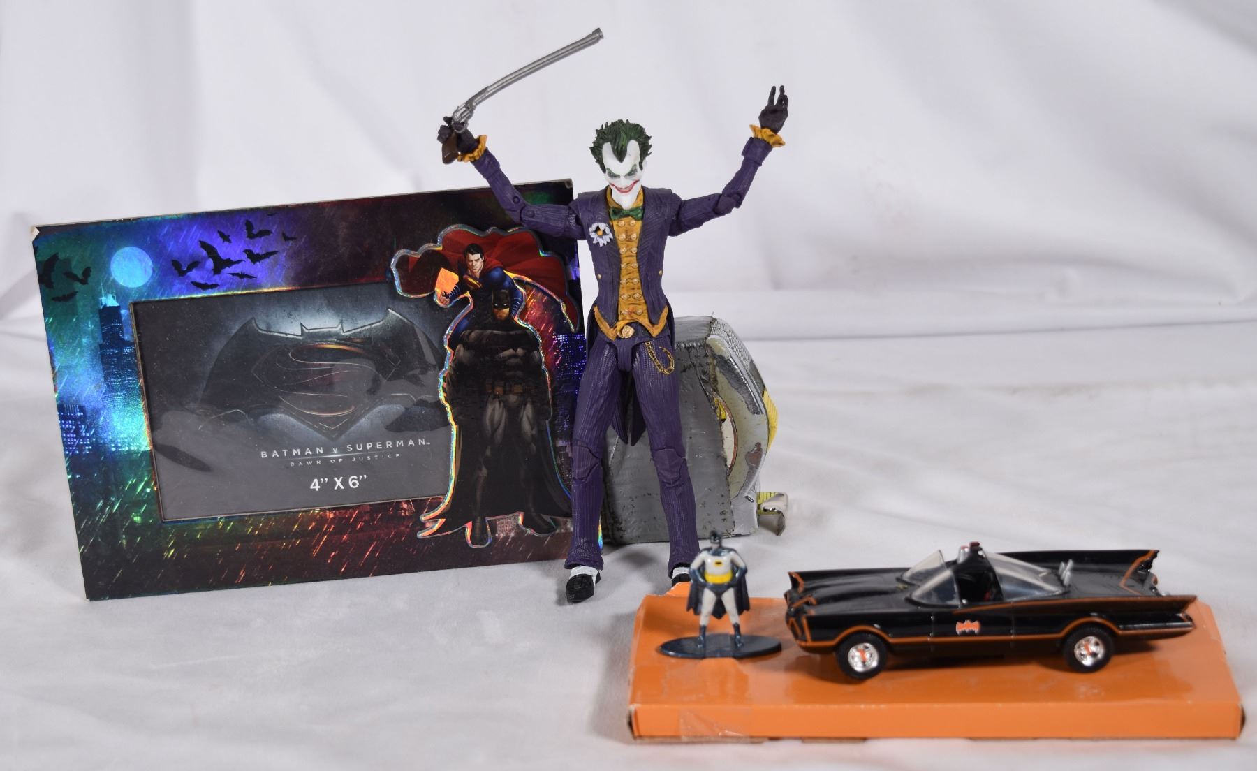Lot Contains 1 Batman Car with Figure, no box but still attached to original cardboard; 1 cardboard Picture Frame, Batman v Superman Dawn of Justice; Joker Figurine, Poseable, 7 " tall; Tape measure NOT included