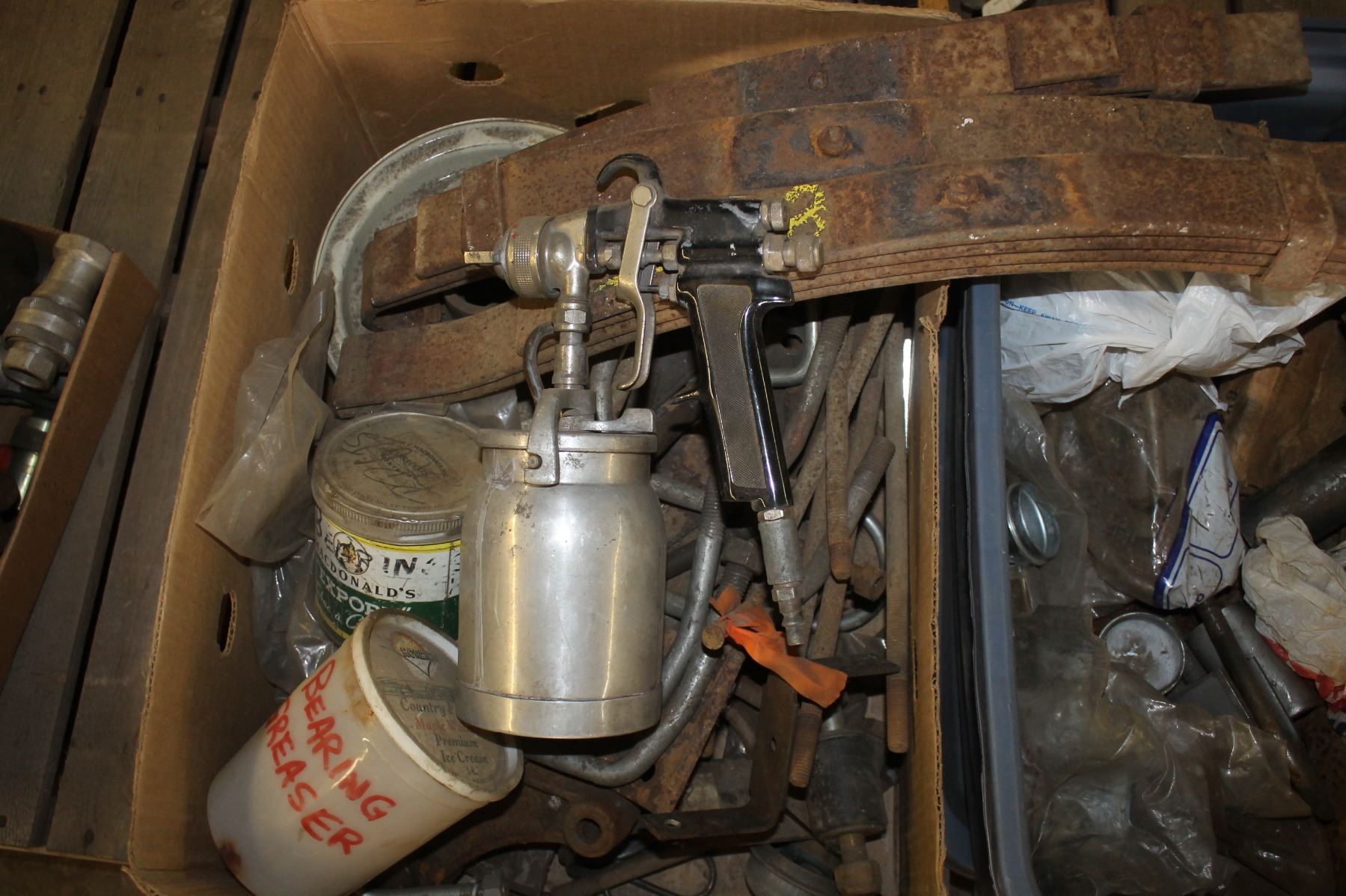 Trailer parts, wheel bearings, U-bolt, springs hub, spring hanger and paint air sprayer.