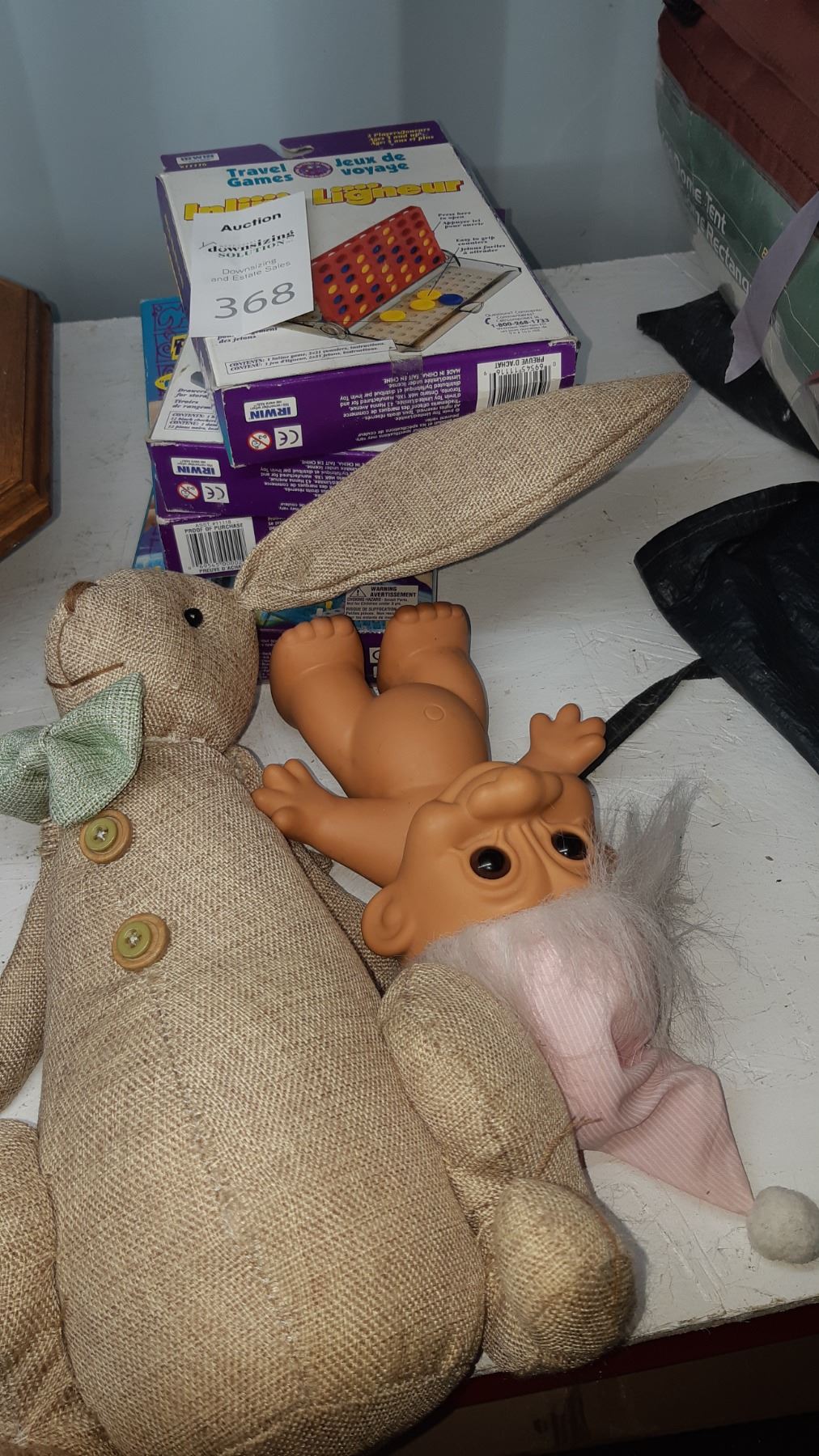 Collection of travel games, stuffed rabbit and troll doll. Pick up 9-10