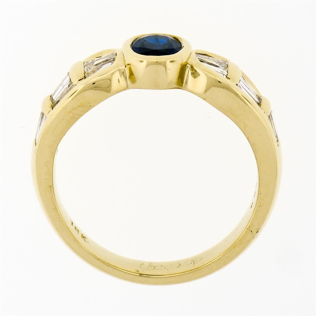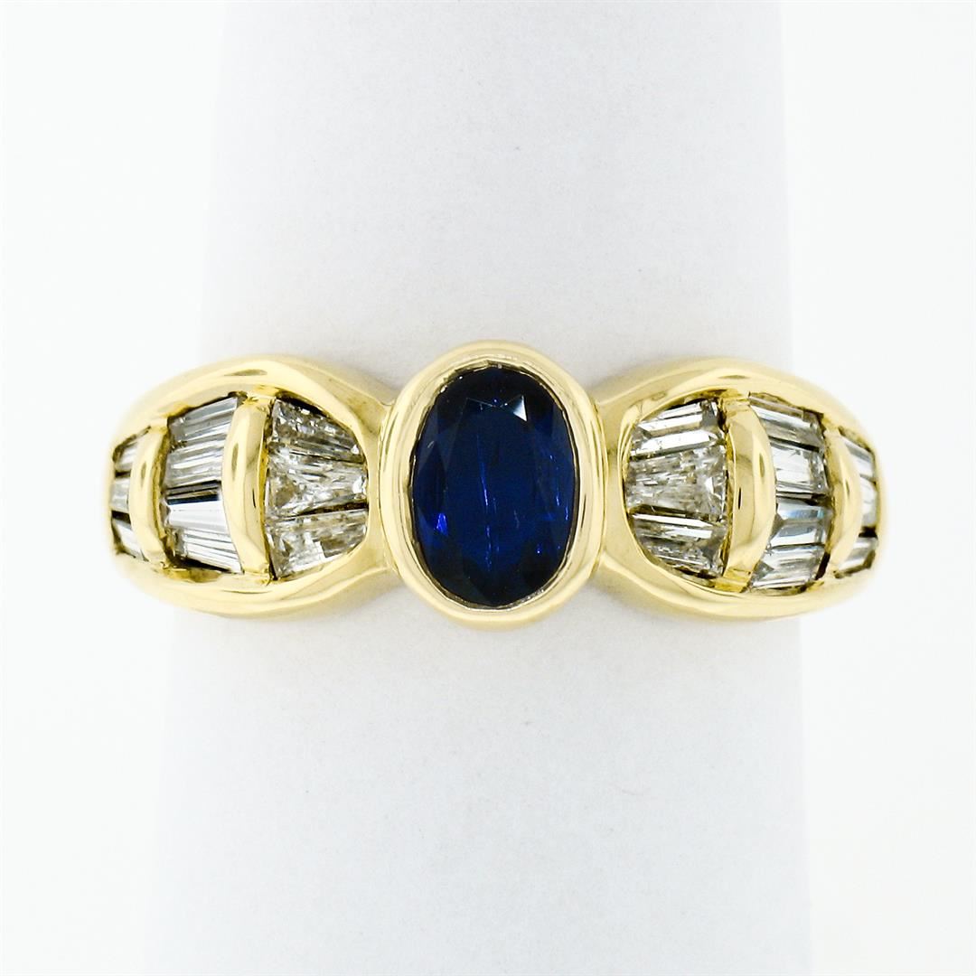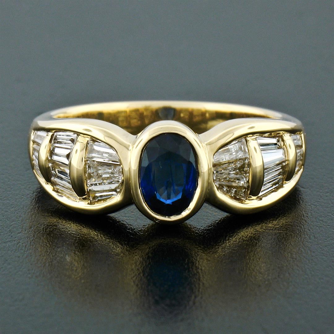 An 18k yellow gold ring made by Trevi featuring an oval cut blue sapphire (0.80ct) and 20 baguette cut diamonds (H/I - VS1/VS2; 1.10ctw). The ring is size 7.5, weighs a total of 7.46 grams, and measures 7.85mm wide.