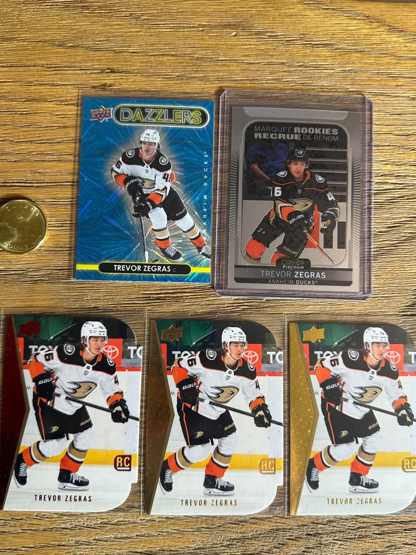 Four-card Trevor Zegras lot featuring 2021-22 UD Dazzlers DZ-1, MR #203, and three YG RCs. Exciting mix from Anaheim Ducks rising star. - Hockey Card
