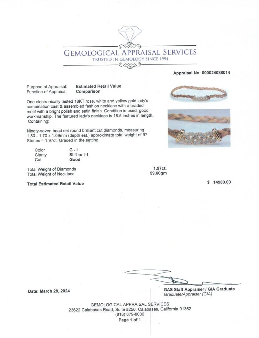 Tricolor Gold Necklace Mounted with 18K Yellow Gold and Diamond Centerpiece containing brilliant cut round diamonds weighing approximately 0.38 cts. Total weight of 59.60 gm. Estimated retail value $14,980