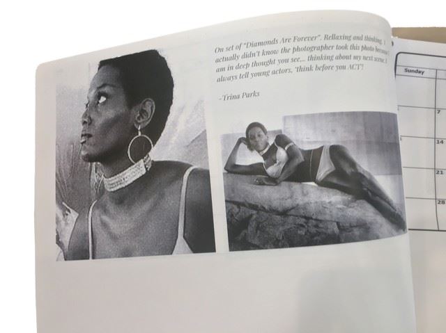 Trina Parks signed 2018 calendar and original prototype calendar with photos. Trina Parks was the first African American singer and dancer featured in the Palm Springs Follies for 6 years from 2002-2008. Features photos of her singing "Jip-Jam-Jive". Trina Parks received President Obama's Lifetime Achievement Award in 2016. She has been featured in Essence Magazine in the article "Black Women of Bond" Tribute photo shoot.
