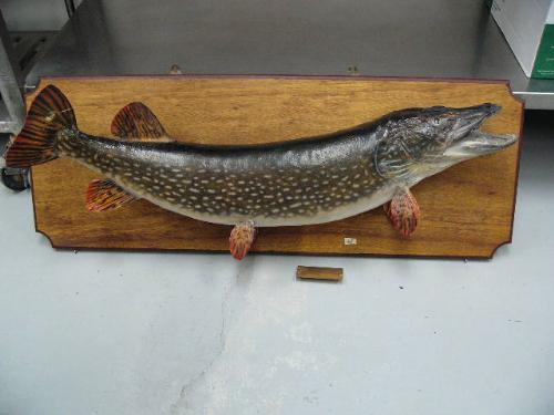 Trophy mounted pike fish- frame size is 44" x 16 " some damage on tail- caught at Sturgeon Lake in 1978 (88)