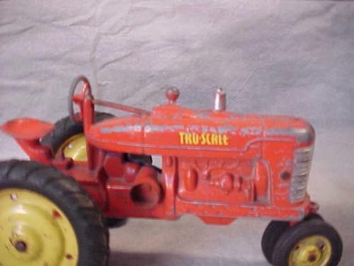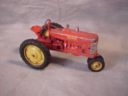 Tru Scale cast iron toy tractor. Red & yellow, left rear axle slightly bent. 8 inches long by 4.5 inches high