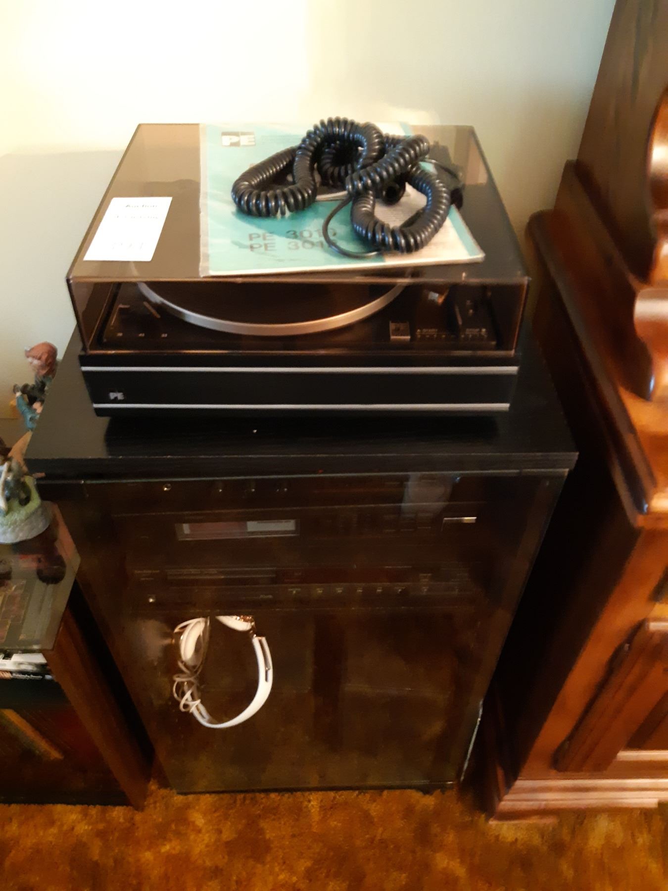 PE turntable, Phillips amp and VHS player, pair of speakers, headphones. Pick up 9-10