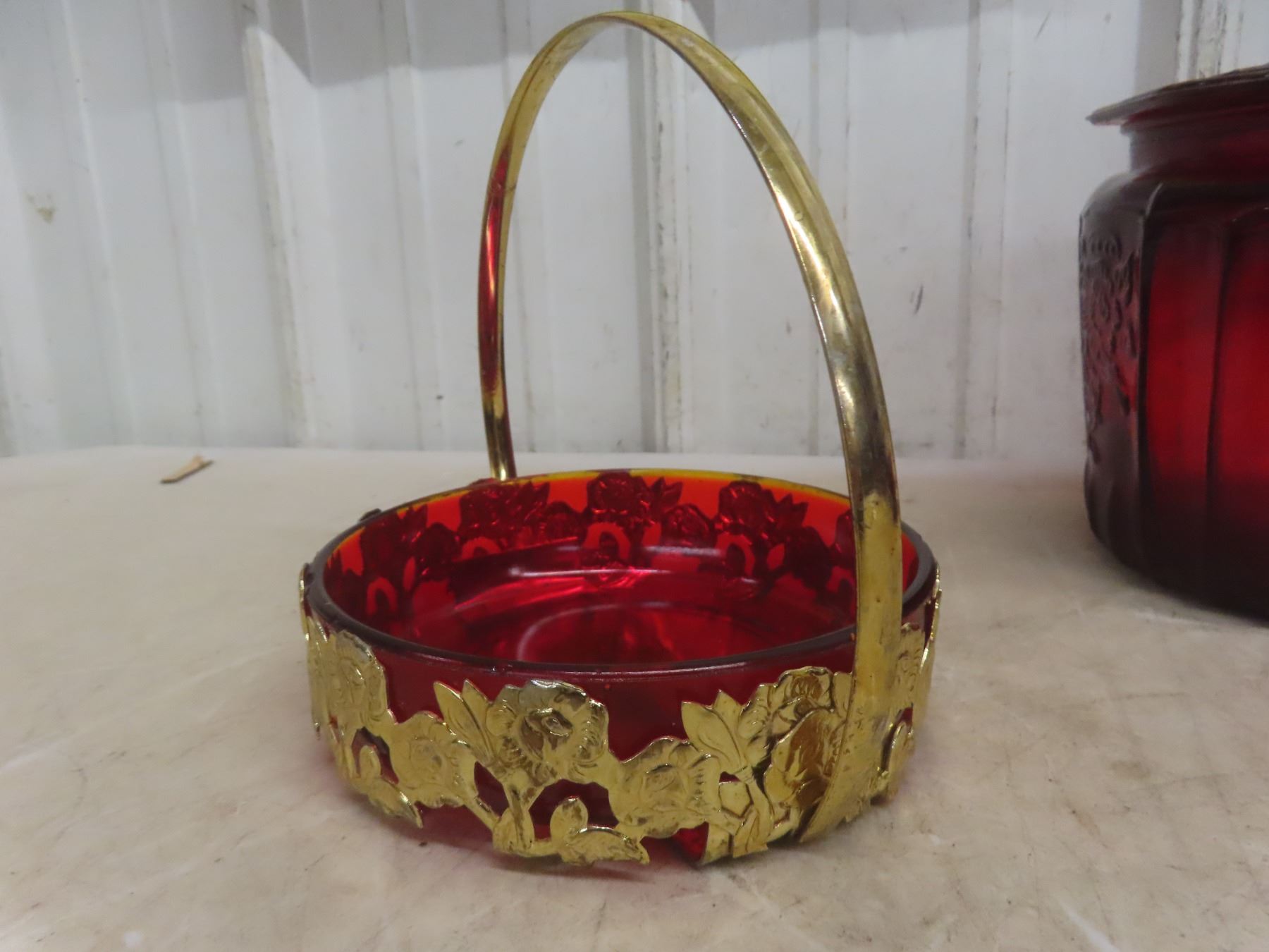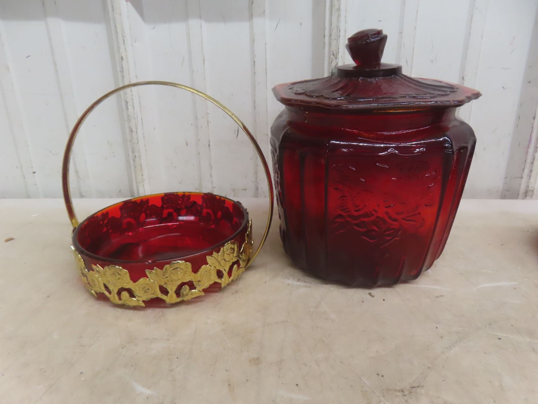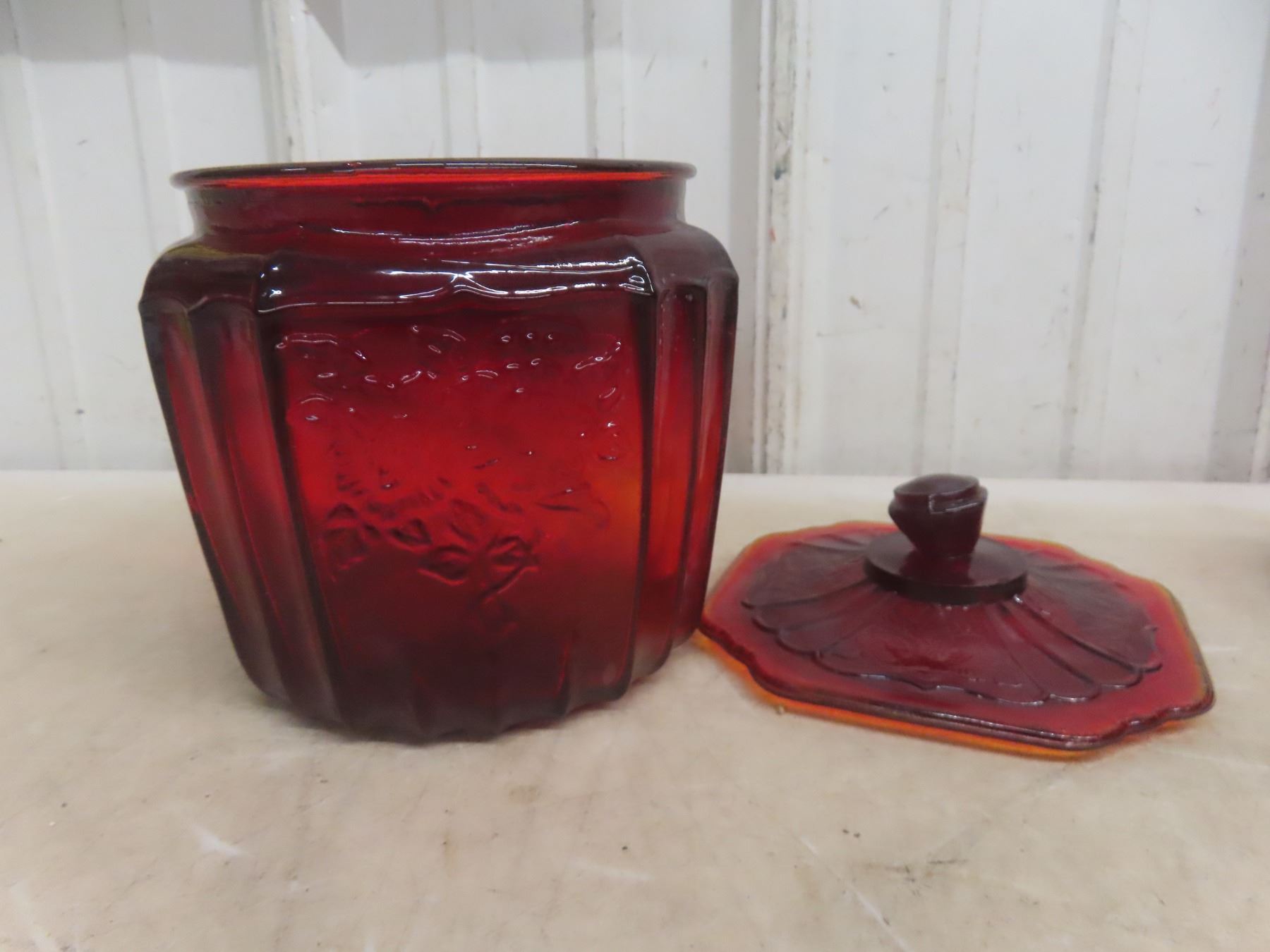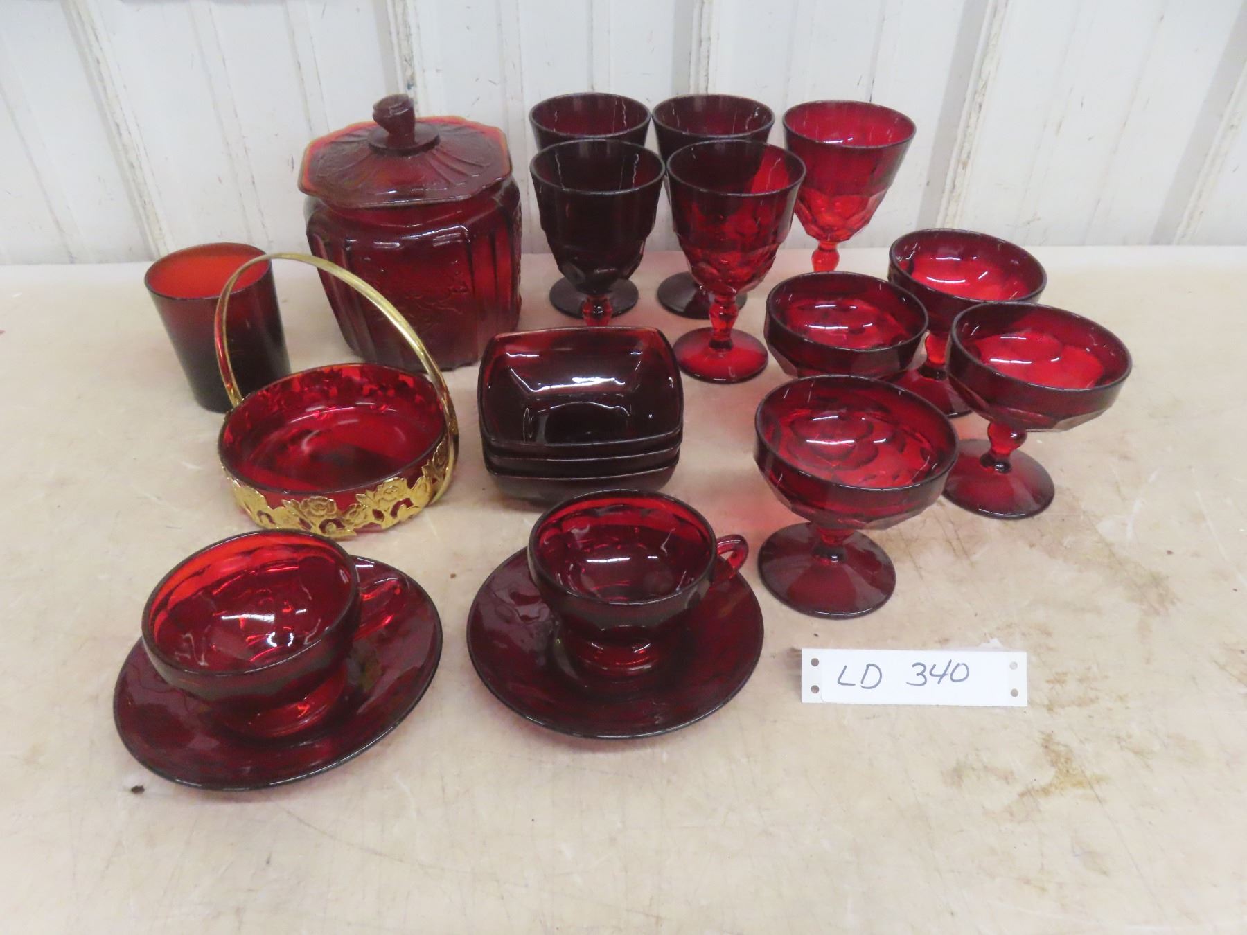 Twenty-Piece Vintage Ruby Red Glassware Set Including Sherbet Glasses, Cups, Saucers, Bowls and Cookie Jar
