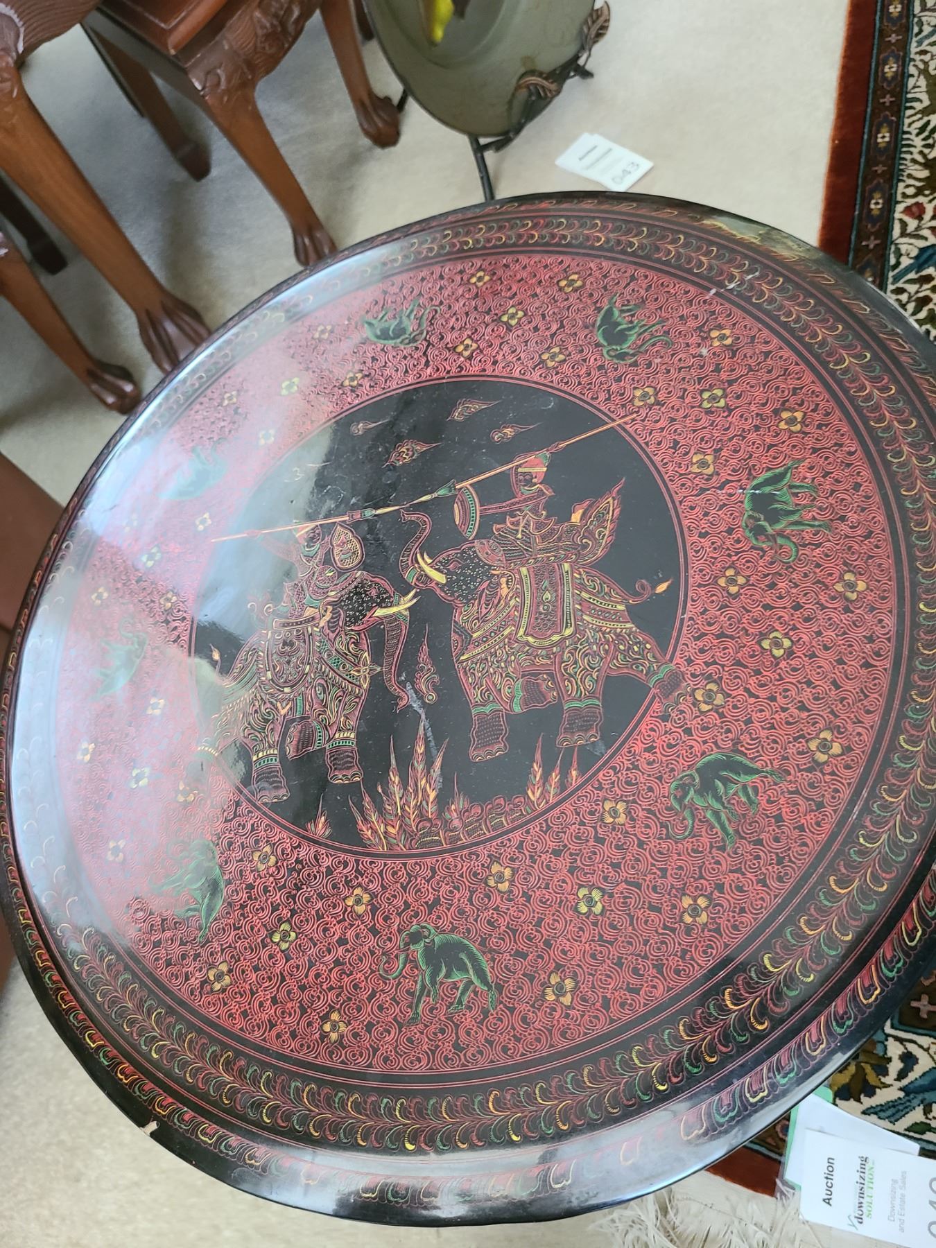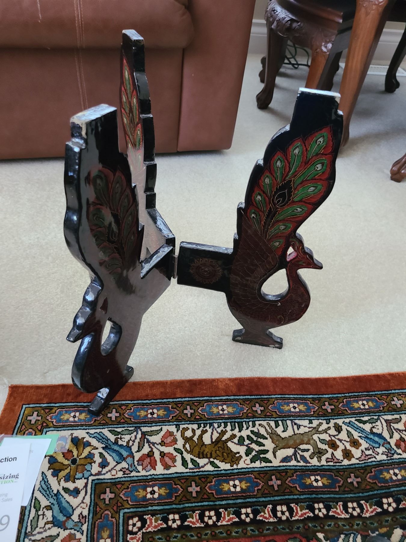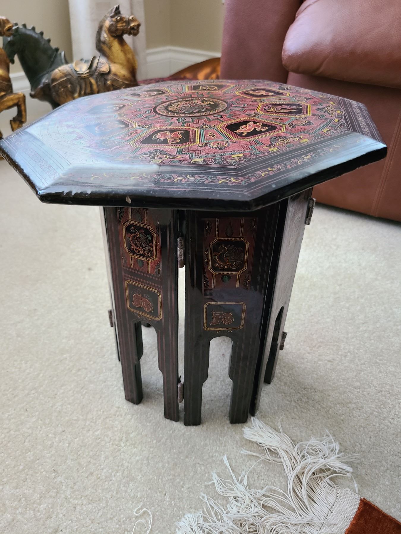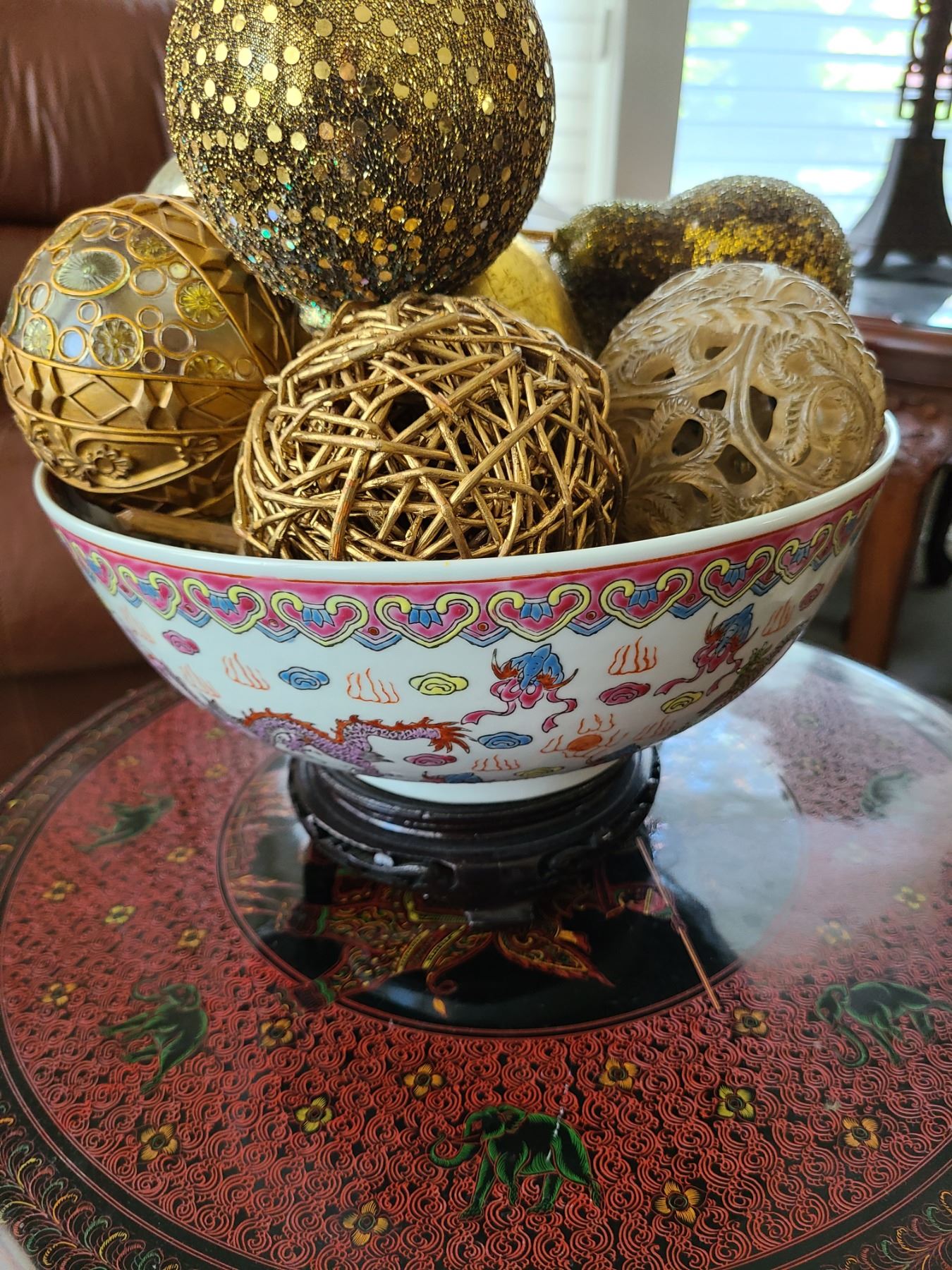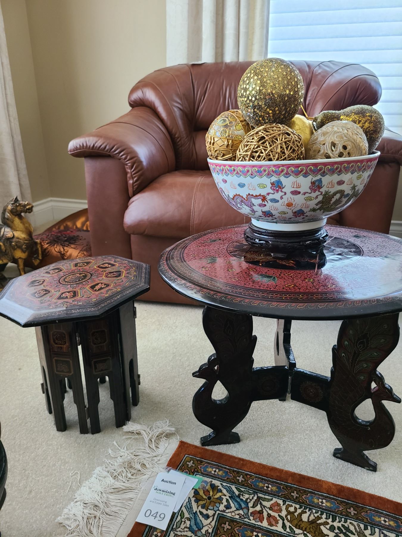 Two Asian style tables on wooden stands and includes bowl of globes. Pickup 10 am.